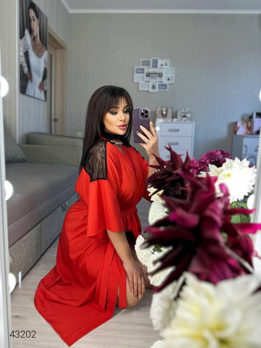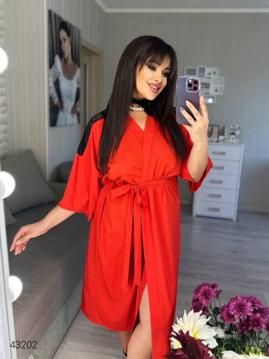 Халат жіночий з мереживом. Плечі халата виконані ніжним мереживом. Тканина: софт, не тягнеться. Склад: поліестер -100%.