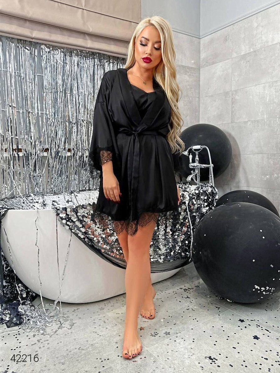 54-56: (халат: ОГ (з урахуванням запаху) - 138 см, довжина - 90 см, рукав - 33 см, топ: ОГ - 130 см, Об'єм резинки під грудьми топу - 86 см, висота топу від плеча - 46 см, шорти: ОТ - 86 см (розтягується до 136 см), ОС - 136 см, довжина - 33 см.)