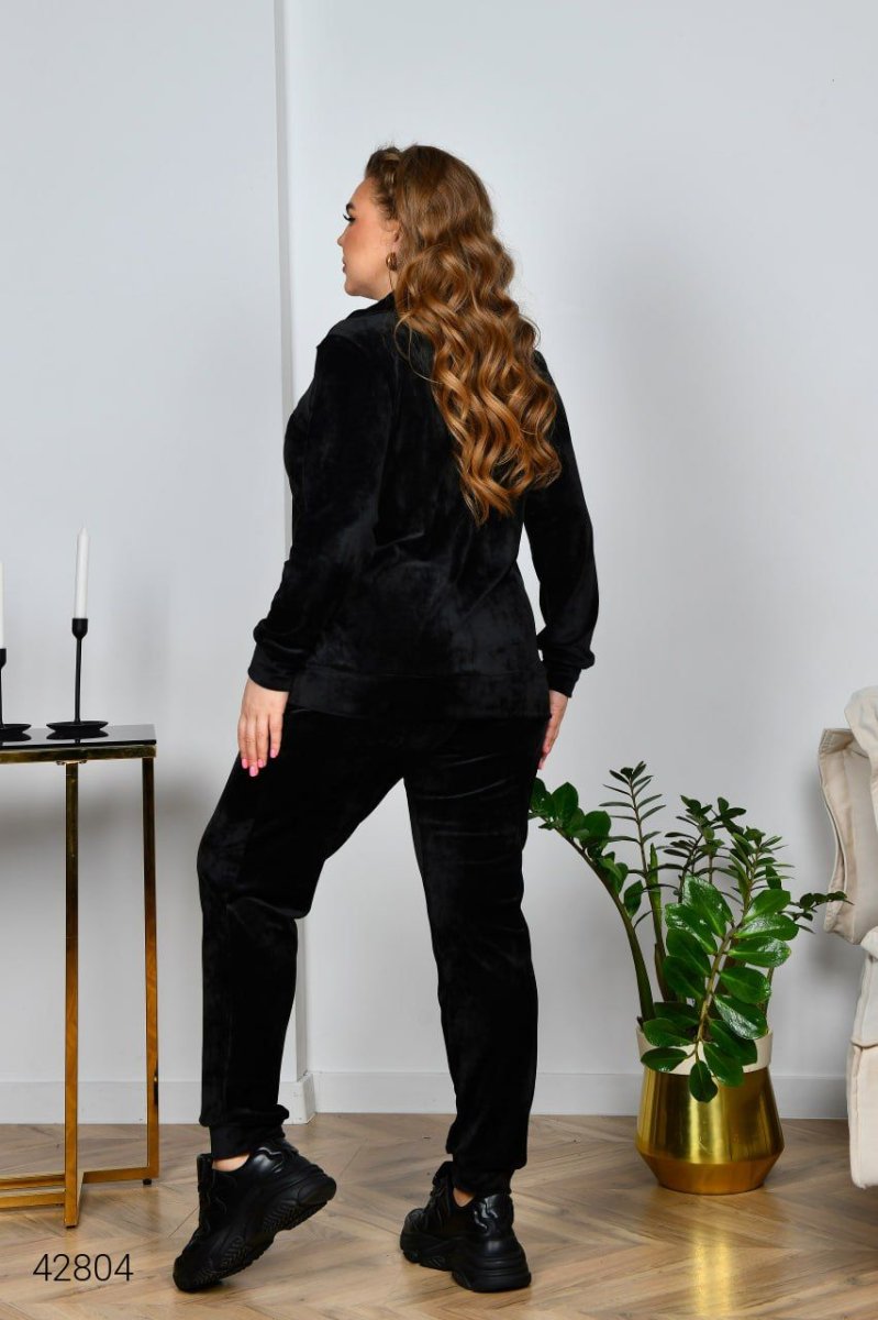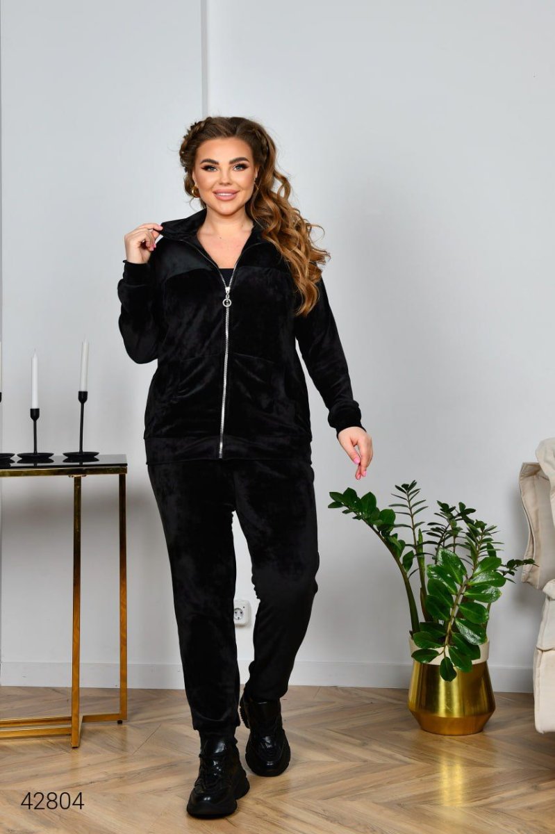 Велюровий костюм жіночий. Застібається на блискавку. Рукав на манжеті. Попереду оброблені кишені «кенгуру». Штани по талії зібрані на гумку. Низ на манжетах.