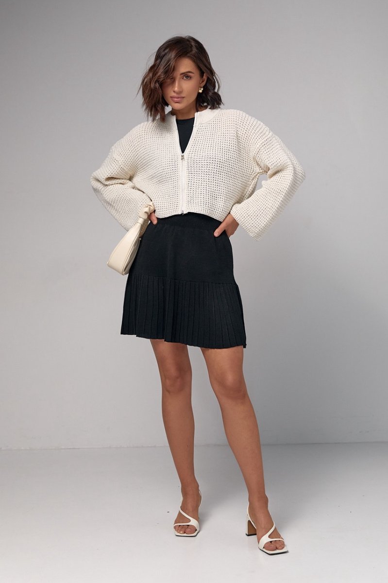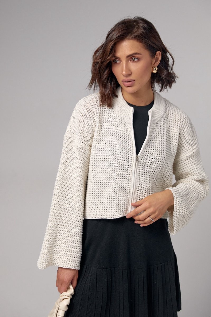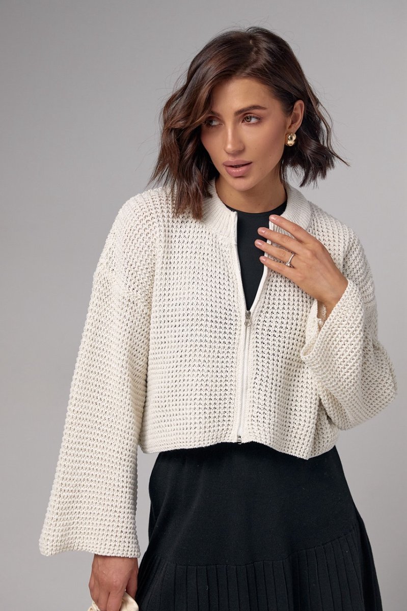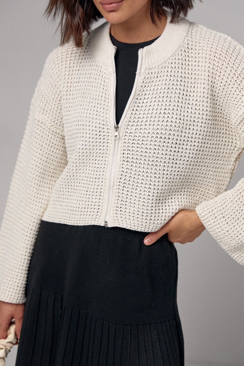 Модель повністю виконана з машинної в'язки і спереду застібається на блискавку. Кругла горловина обшита в'язаною окантовкою, а довгі рукави мають розширений фасон. Лінія плеча трохи опущена.