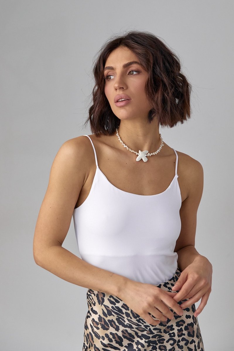 Ця модель виконана з еластичної тканини, яка добре тягнеться. Низ виробу застібається на кнопки. Тонкі бретелі-резинки йдуть без регулювання довжини. Спереду та ззаду боді доповнено короткою підкладкою з основної тканини, яка дозволяє виробу не просвічується.