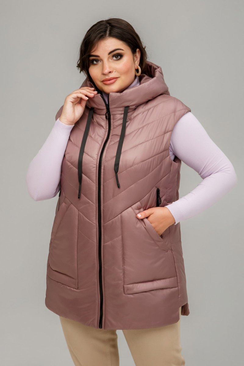 Жилет прямого силуету зі стьобаної плащової тканини. Застібка на блискавку. Висота капюшону регулюється за допомогою шнурка. По поличці виконані накладні кишені декоровані закріпками та додатковими, функціональними кишенями на змійці. Підкладка – нейлон.