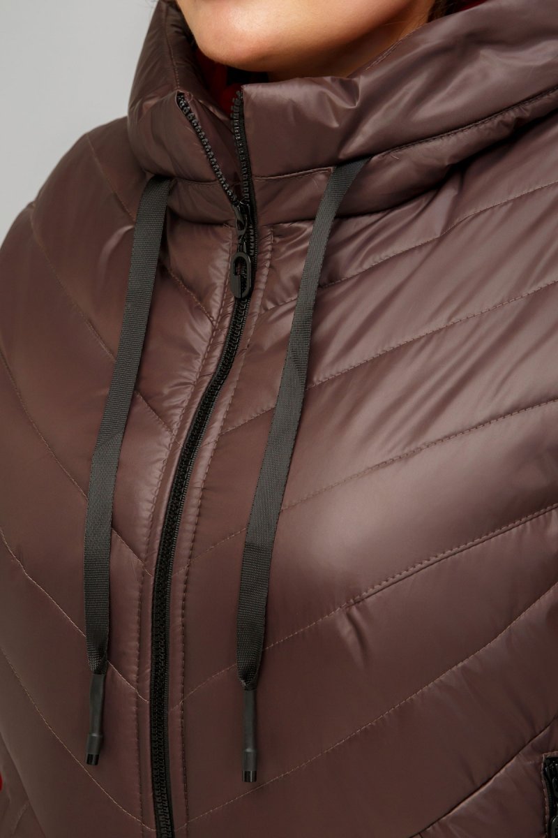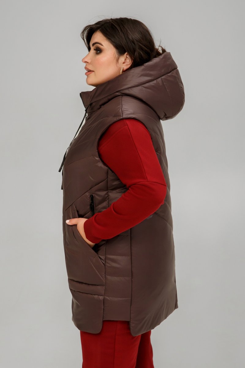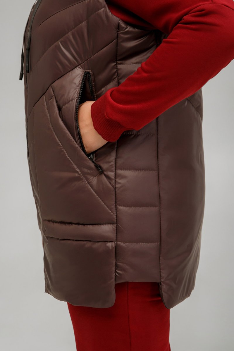 Жилет прямого силуету зі стьобаної плащової тканини. Застібка на блискавку. Висота капюшону регулюється за допомогою шнурка. По поличці виконані накладні кишені декоровані закріпками та додатковими, функціональними кишенями на змійці. Підкладка – нейлон.