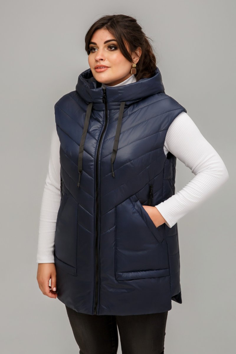 Жилет прямого силуету зі стьобаної плащової тканини. Застібка на блискавку. Висота капюшону регулюється за допомогою шнурка. По поличці виконані накладні кишені декоровані закріпками та додатковими, функціональними кишенями на змійці. Підкладка – нейлон.
