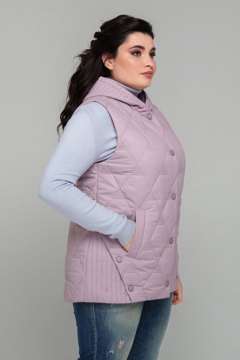 Жилет виконаний із плащової тканини, наповнювач: тинсулейт (100 г/м2). Застібка на кнопку. Капюшон втачний (незнімний). З боків виконані підрізи, оздоблені декоративною кнопкою. Кишені прорізні лісточка. Підкладка: нейлон.