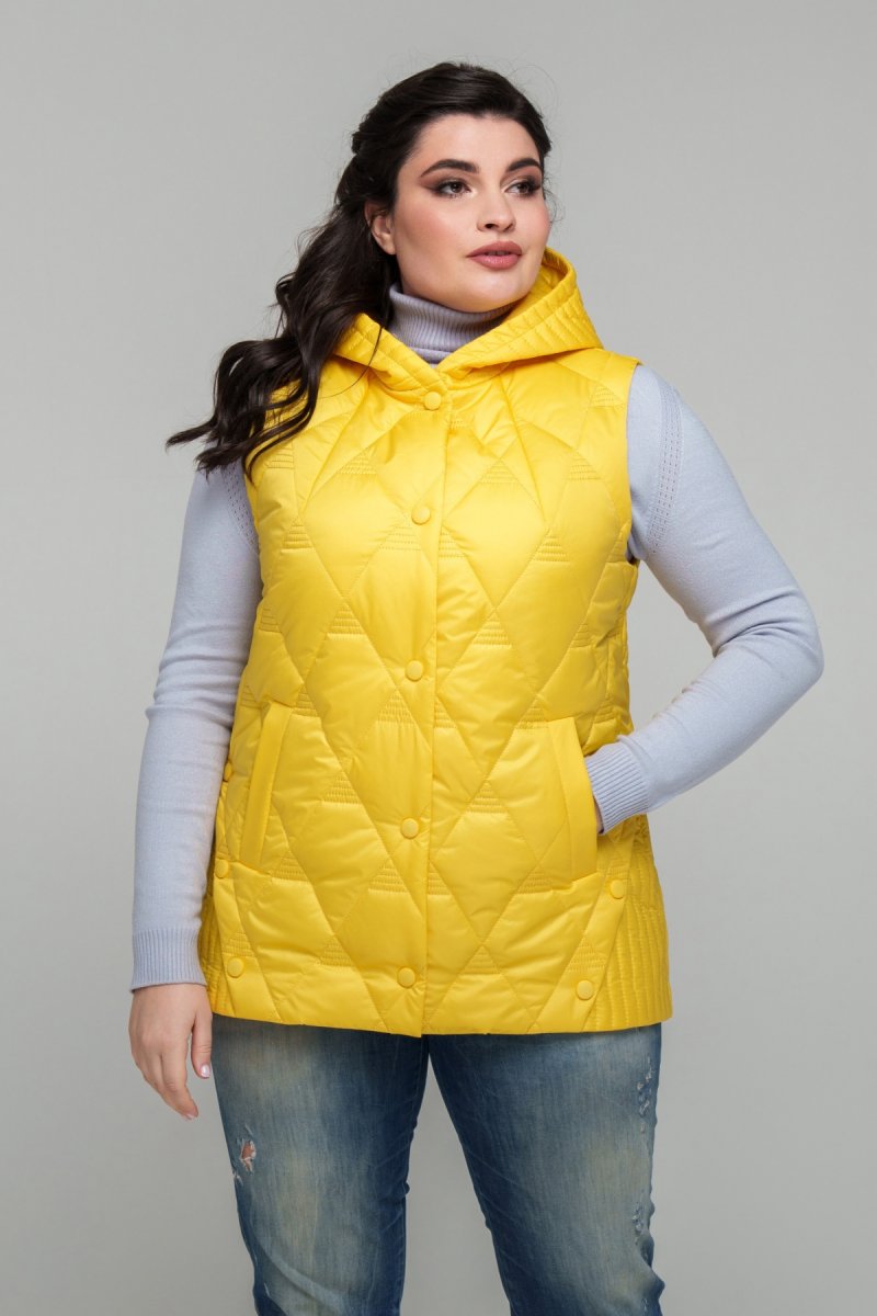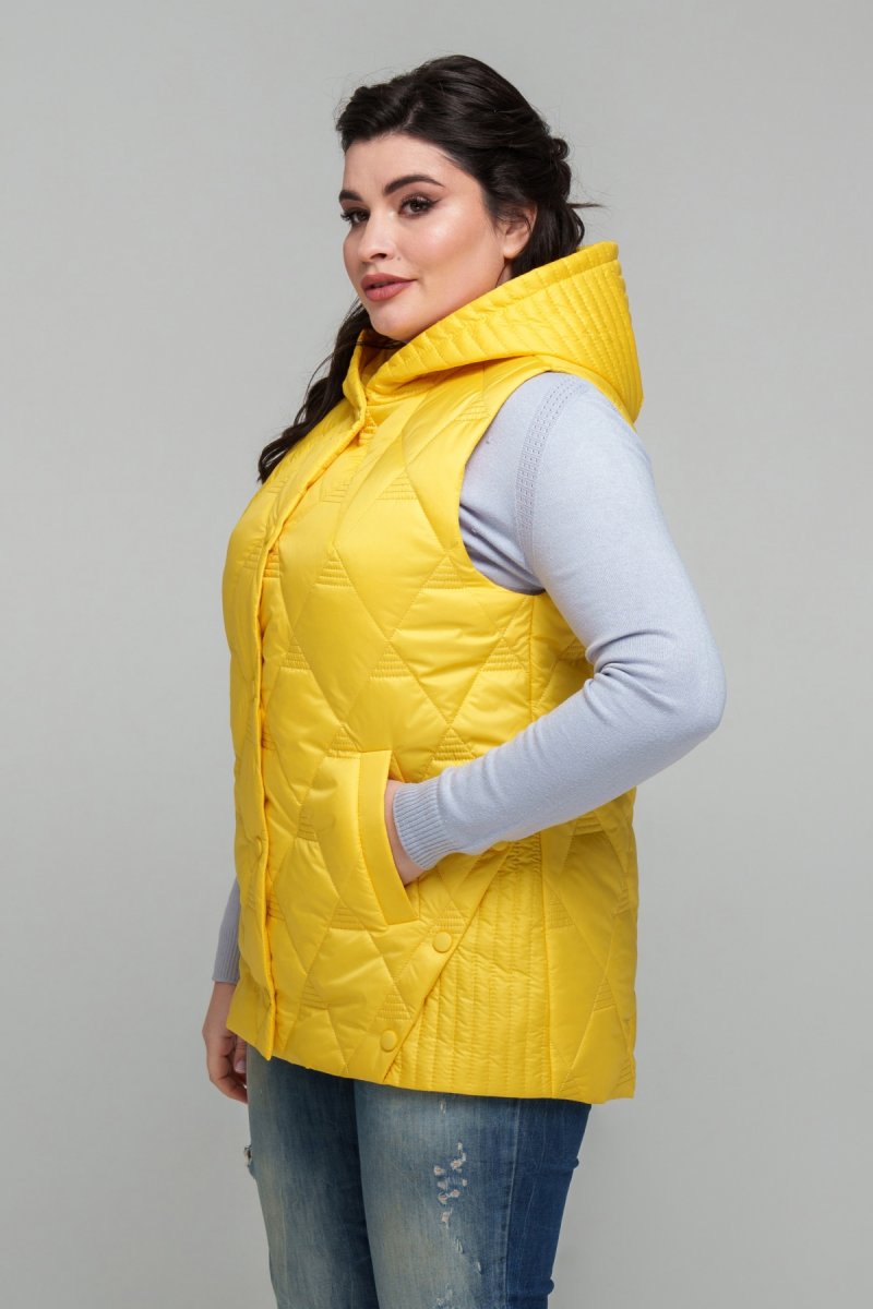 Жилет виконаний із плащової тканини, наповнювач: тинсулейт (100 г/м2). Застібка на кнопку. Капюшон втачний (незнімний). З боків виконані підрізи, оздоблені декоративною кнопкою. Кишені прорізні лісточка. Підкладка: нейлон.