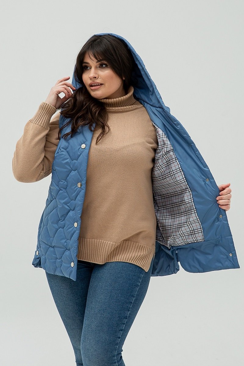 Жилет виконаний із стьобаної плащової тканини, наповнювач – силікон (100), підкладка – нейлон. Застібка на кнопках. Капюшон втачний.