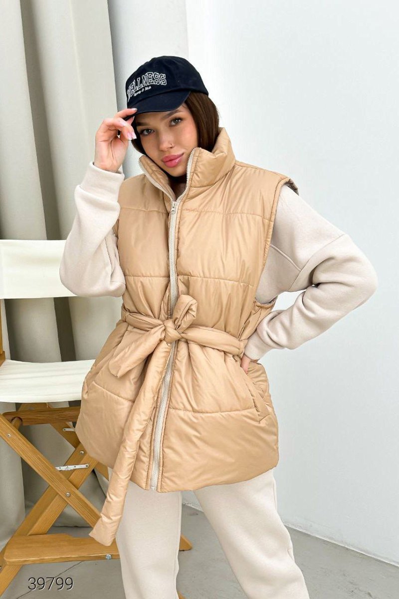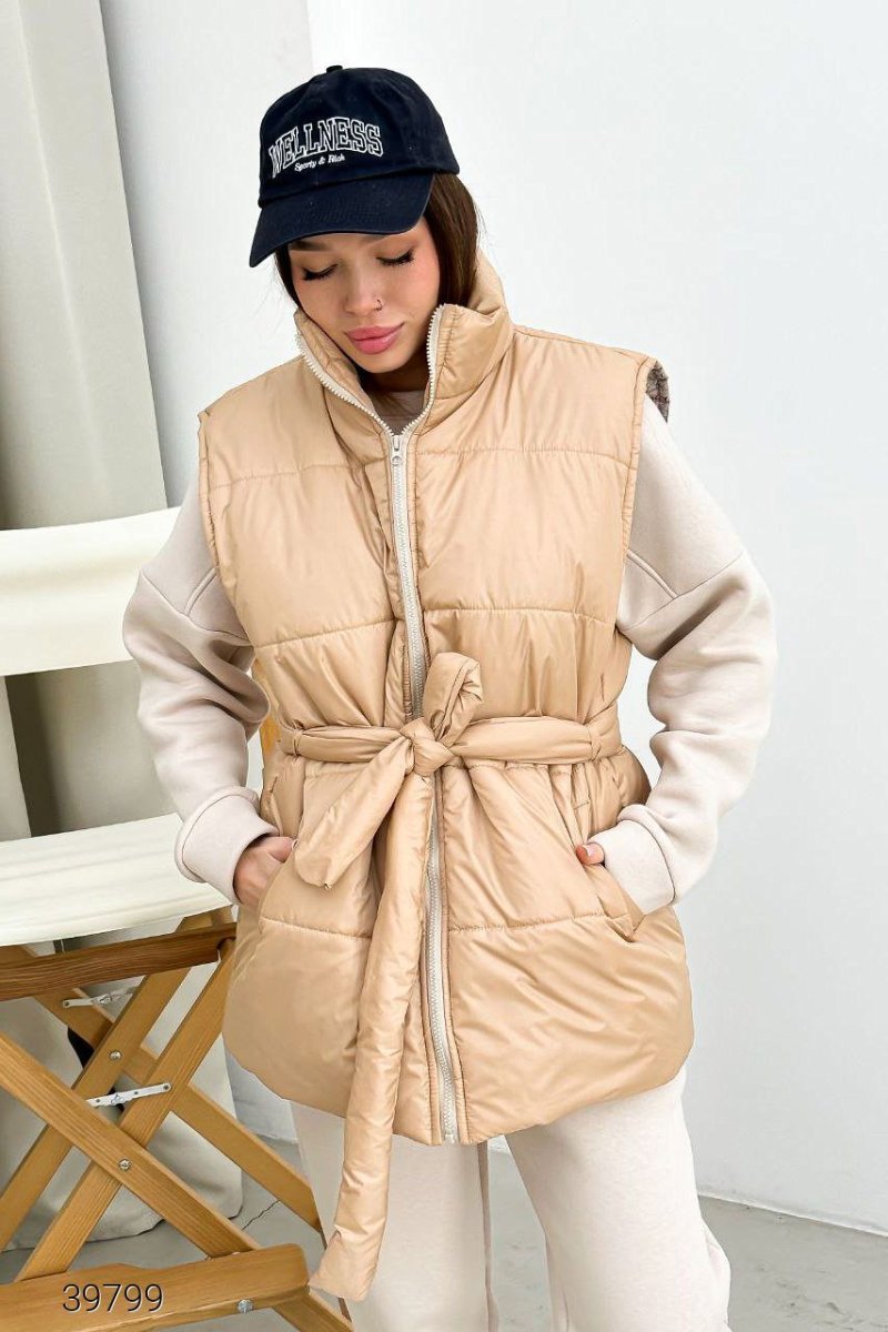 Жилет жіночий стьобаний. Застібається на блискавку, у комплекті пояс. Є кишені. Тканина: водовідштовхувальна плащівка з підкладом, утеплювач силікон 200 г.м2.