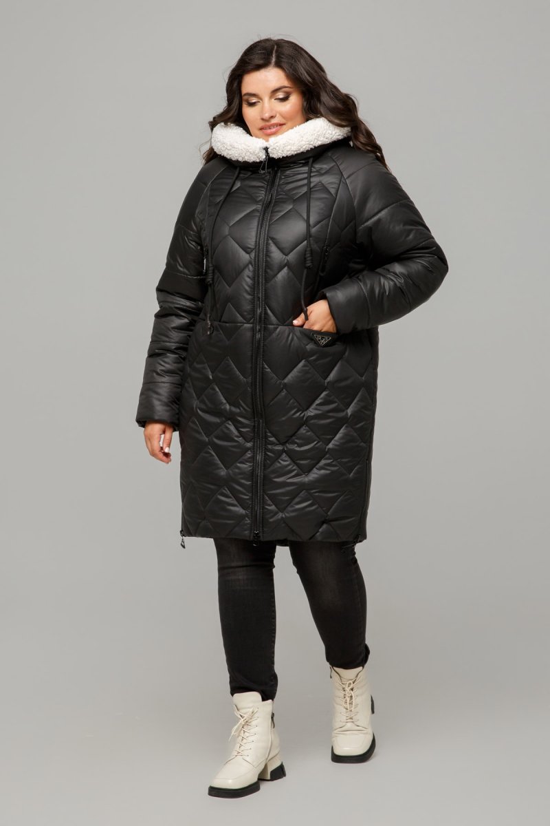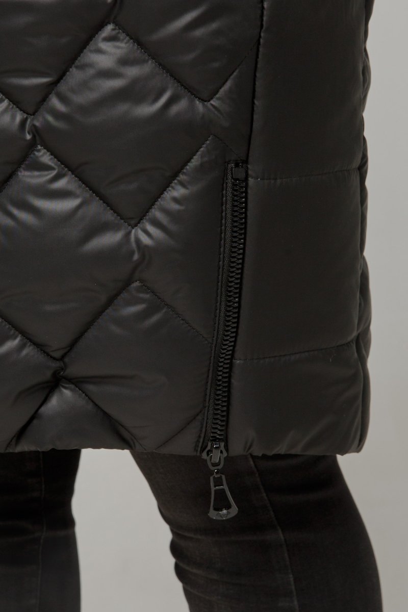 Зимова куртка прямого силуету, звужена донизу. У рельєфних швах полиці виконані кишені на блискавку, по лінії талії- кишеня на кнопку. Бічні шви внизу декоровані блискавкою. Спинка відрізна по лінії талії з імітацією кокетки відліту.