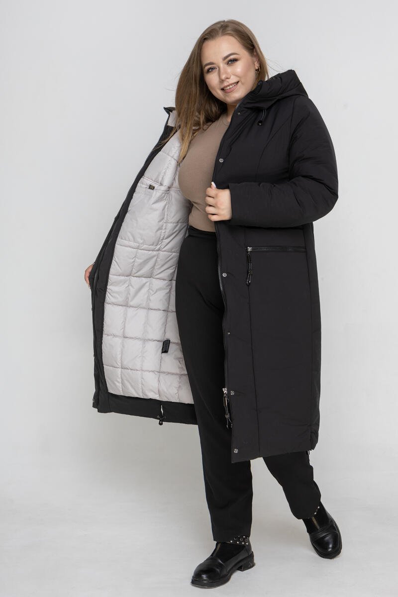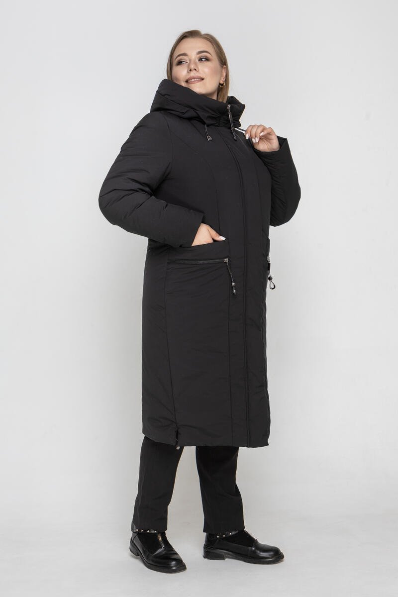 Стильне зимове пальто прямого силуету для власниць пишних форм. Виріб має вшитий каптур з куліскою. Жіноче пальто застібається на молнію та планку з кнопками.