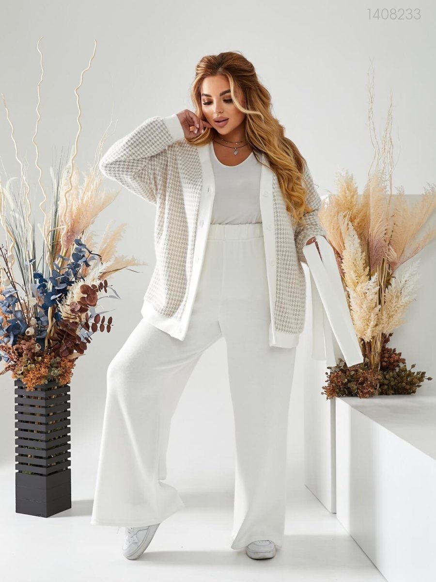 Подробности: кардиган свободного кроя на пуговицах с поясом. Брюки-палаццо высокой посадкой с поясом на широкой резинке, глубокими вместительными карманами.