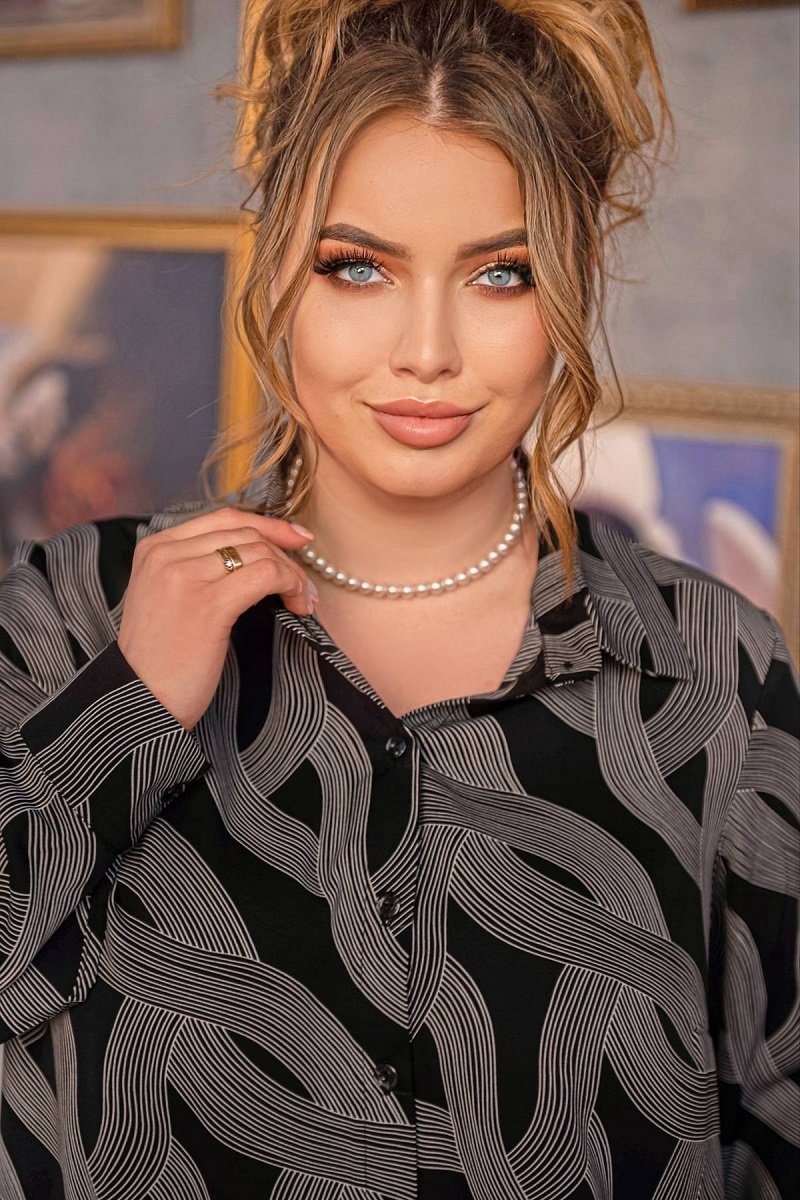 Женская классическая блузка рубашечного кроя. Застёгивается на пуговицы. Рукава на манжетах, отложный воротник. Прямой силуэт блузы подходит к брюкам или юбке немного зауженного кроя.