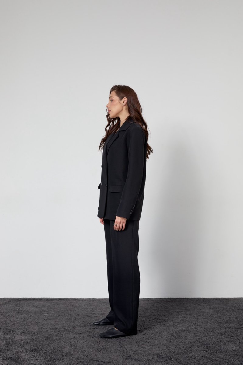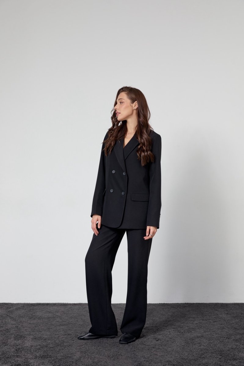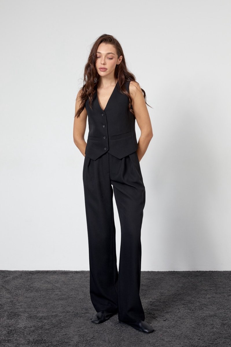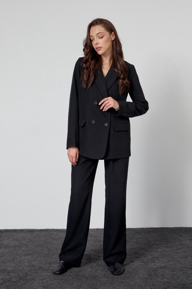 Классический костюм – тройка: пиджак, жилет, брюки палаццо. Пиджак двубортный, на подкладке, длиной ниже линии бедер. Рукава вшивные, длинные, двушовные с пуговицами на имитированной шлике. Карманы прорезные с обшивками. Воротник пиджачного типа, застегивающийся на пуговицы, низ края борта округлен. Жилет классический, без рукавов. Брюки прямого кроя На талии шлевки для съемного пояса. Застежка: пуговица и скрытая молния. Передние половинки со стрелками и складками. Карманы находятся в боковых швах. Задние половинки с выточками.