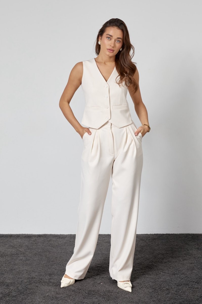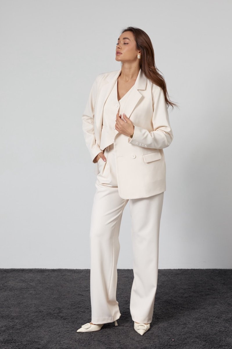 Классический костюм – тройка: пиджак, жилет, брюки палаццо. Пиджак двубортный, на подкладке, длиной ниже линии бедер. Рукава вшивные, длинные, двушовные с пуговицами на имитированной шлике. Карманы прорезные с обшивками. Воротник пиджачного типа, застегивающийся на пуговицы, низ края борта округлен. Жилет классический, без рукавов. Брюки прямого кроя На талии шлевки для съемного пояса. Застежка: пуговица и скрытая молния. Передние половинки со стрелками и складками. Карманы находятся в боковых швах. Задние половинки с выточками.