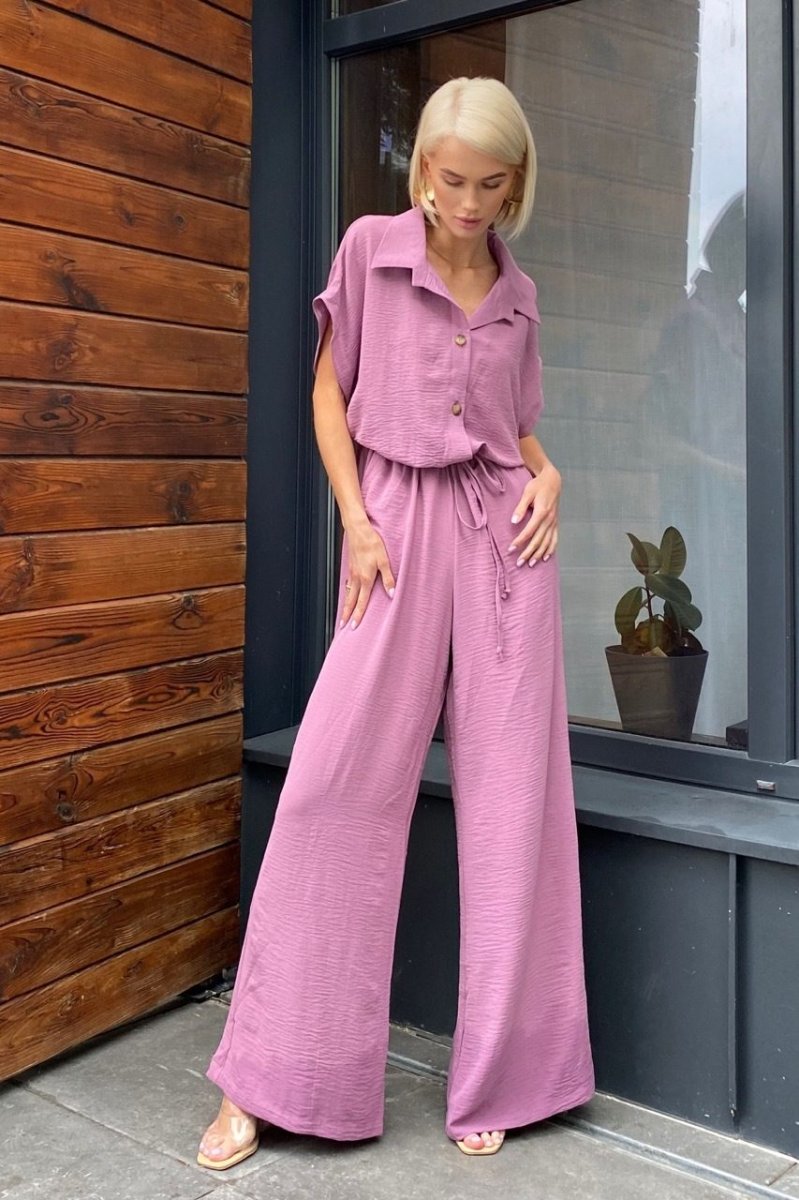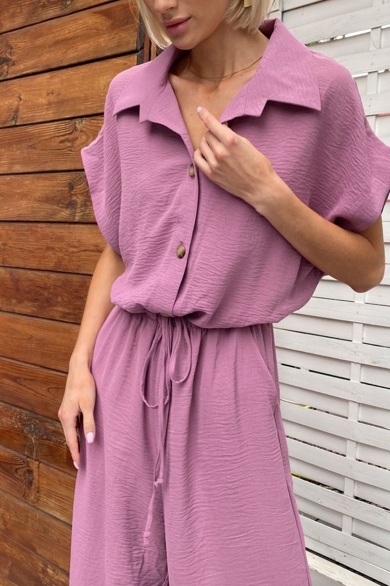 Невероятно нежный и легкий комбез подарит комфорт в жаркие летние дни. Свободный силуэт комбинезона подойдёт каждой девушке и будет универсальным для любого типа фигуры. Рубашковый воротник позволит подчеркнуть хорошую линию шеи, карманы в боковых швах добавят практичности и удобства. В таком наряде Вы будете романтичным и очаровательным. По талии кулиска со шнуром.