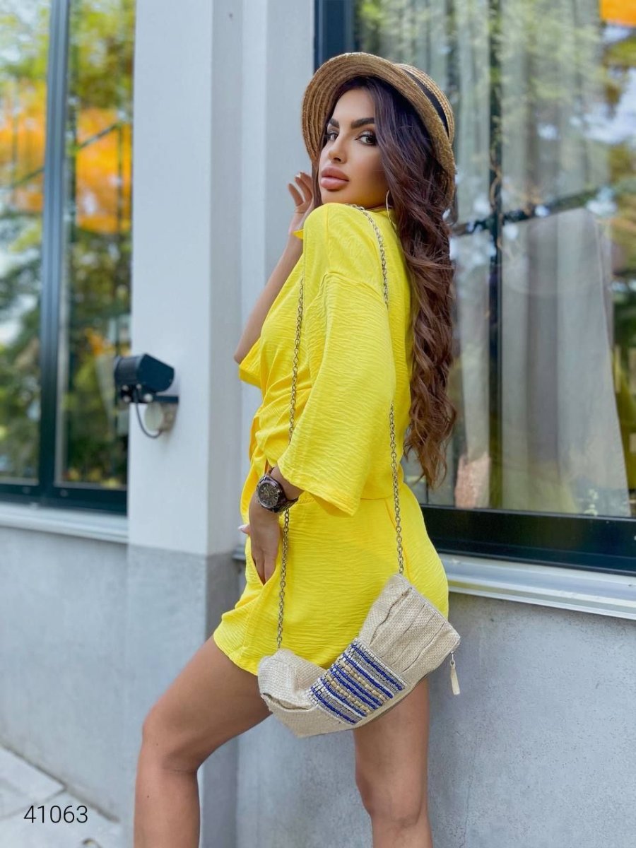 Костюм из легкого жатого коттона. Рубашка с рукавами три четверти, отложной ворот, заниженная линия плеч, планка на пуговицах. Шорты с завышенной талией, пояс на резинке с затягивающимся шнурком, боковые карманы.