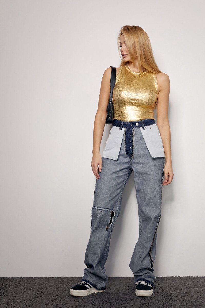 Модель сшита из трикотажа в мелкий рубчик, с прямым низом и с широкой окантовкой пройм и круглой горловины.