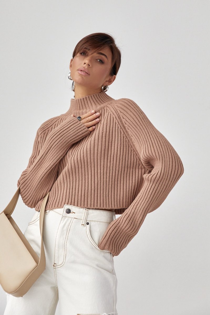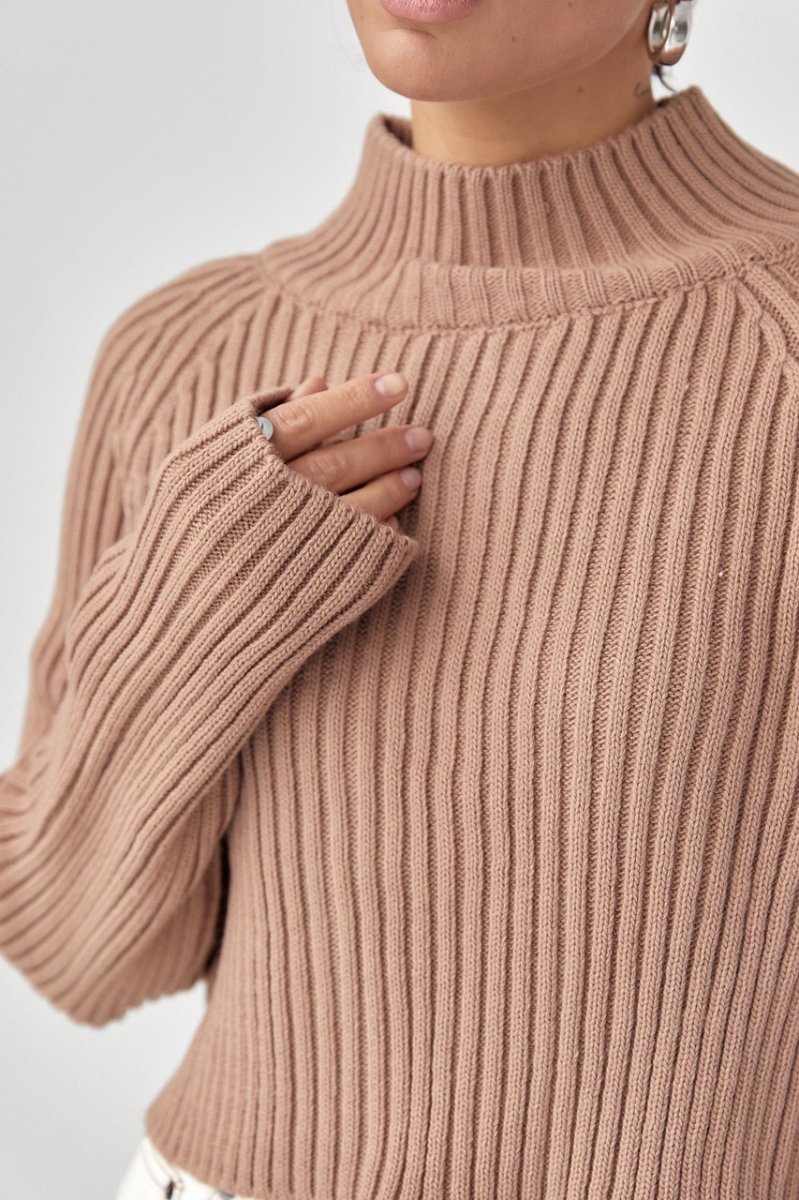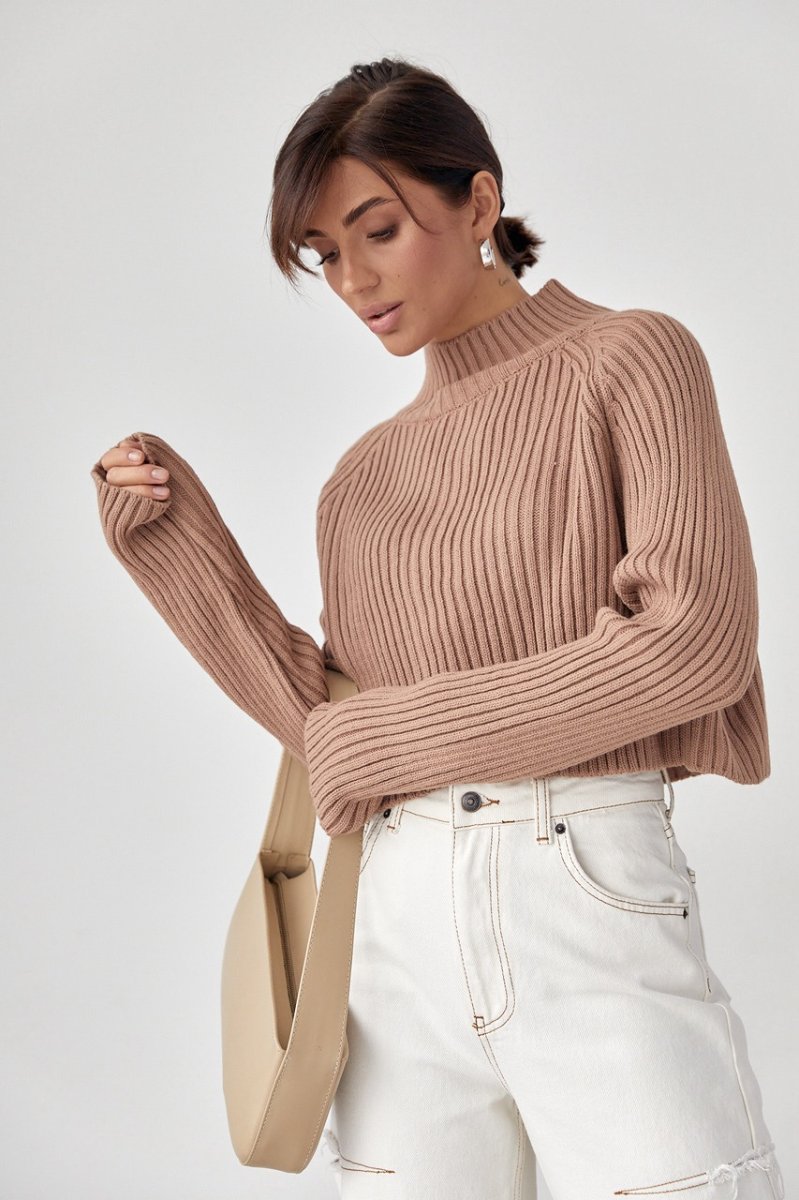 Модель полностью выполнена из фактурной машинной вязки в технике "резинка". Низ прямой, рукава длинные, а круглая горловина дополнена высоким воротником-стойкой.