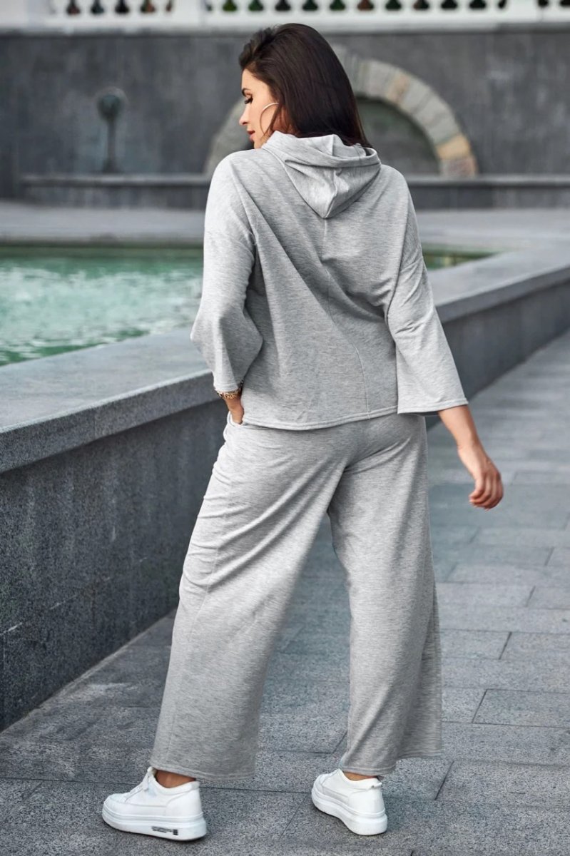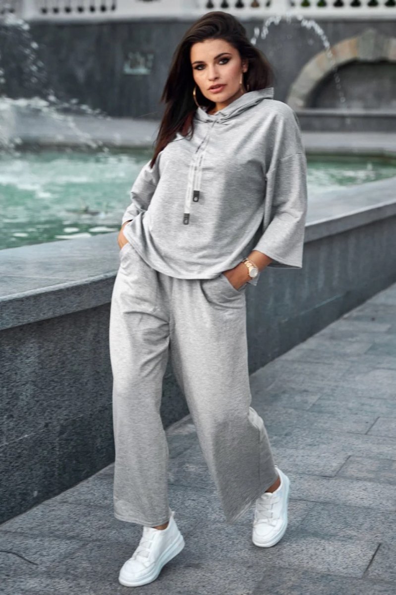 Коллекция Goodbye summer plus size представляет костюм свободного кроя для молодежного спортивного или повседневного образа. Он состоит из широких брюк с завышенной талией и кофты с капюшоном прямого фасона. Горловину дополняют шнурки и хольнитены. Особую изюминку образу обеспечивают рукава-колокол с длиной три четверти.