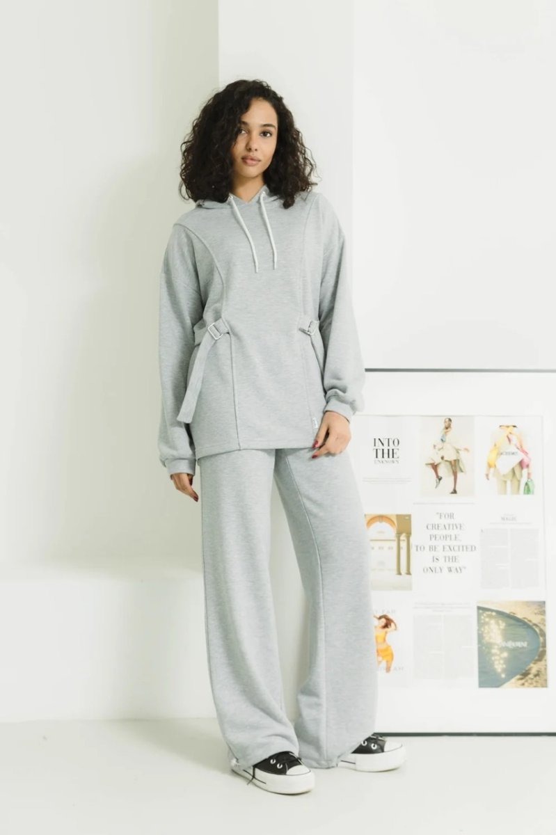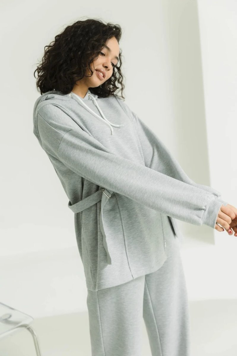 Конструктивные элементы: разрезная полка, брюки на резинке, капюшон