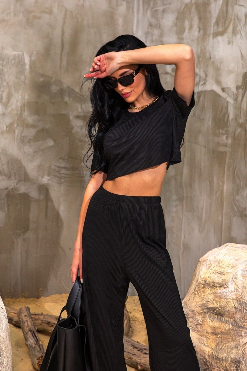 Стильный и удобный летний костюм, который будет незаменим в жаркие дни. Широкие брюки палаццо и объемная укороченная футболка подойдут для девушки с любым типом фигуры.