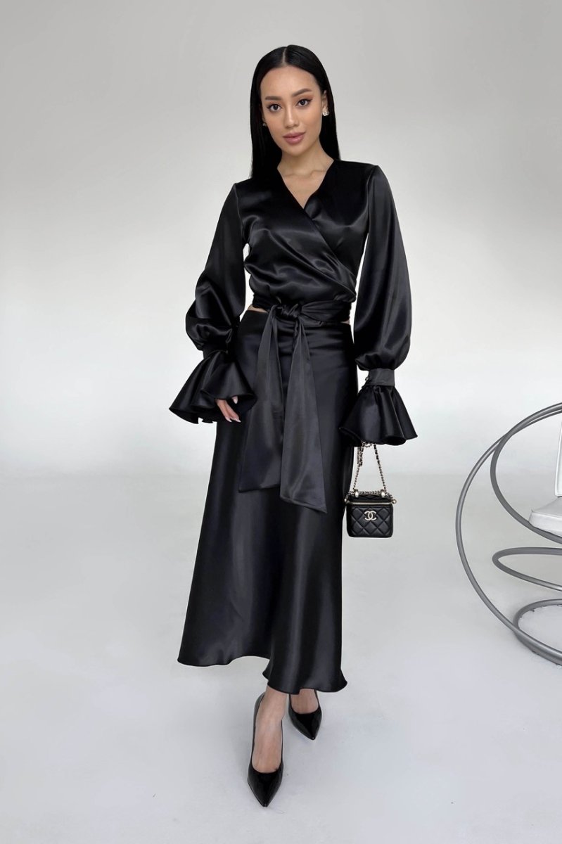 Юбка – миди с резинкой по талии свободного кроя и блуза на запАх с длинным поясом. На рукавах манжеты с воланами.