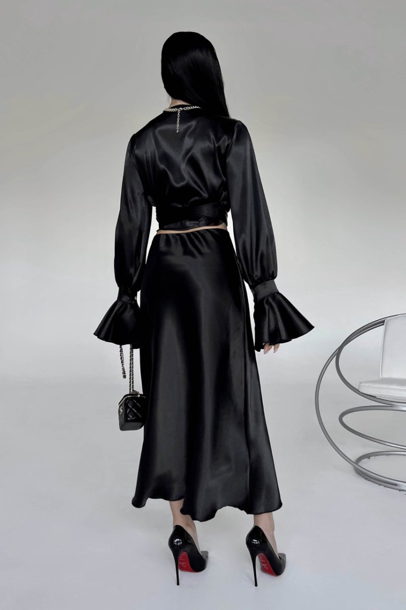Непревзойденно нежная и женственная модель костюма с юбкой из королевского атласа.