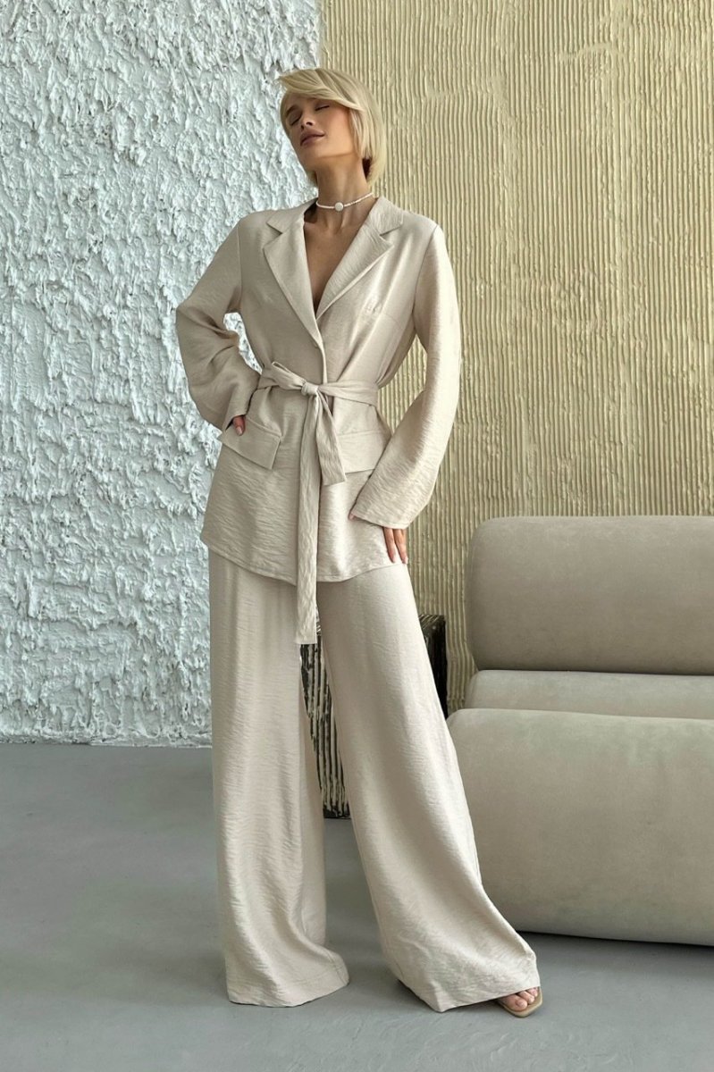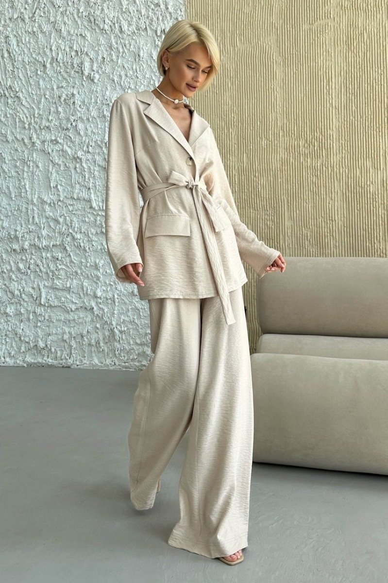 Пиджак с лацканами прямого кроя в комплекте с трендовыми штанами палаццо – отлично подойдет на жаркое лето.