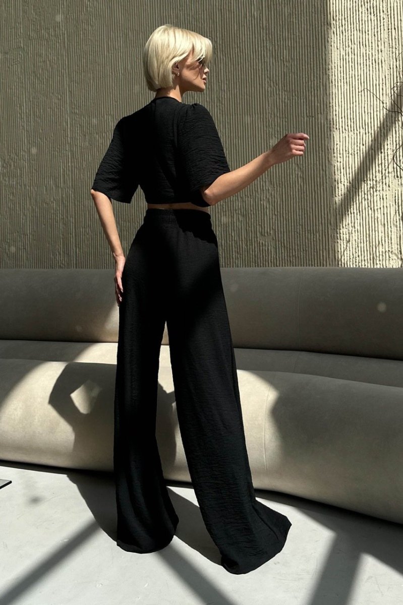 Практичный костюм с топом на завязках и глубоким декольте задает настроение всему образу. Костюм выполнен из легкого американского крепа. Топ с короткими рукавами. Брюки свободного кроя с эластичной вставкой в талии.
