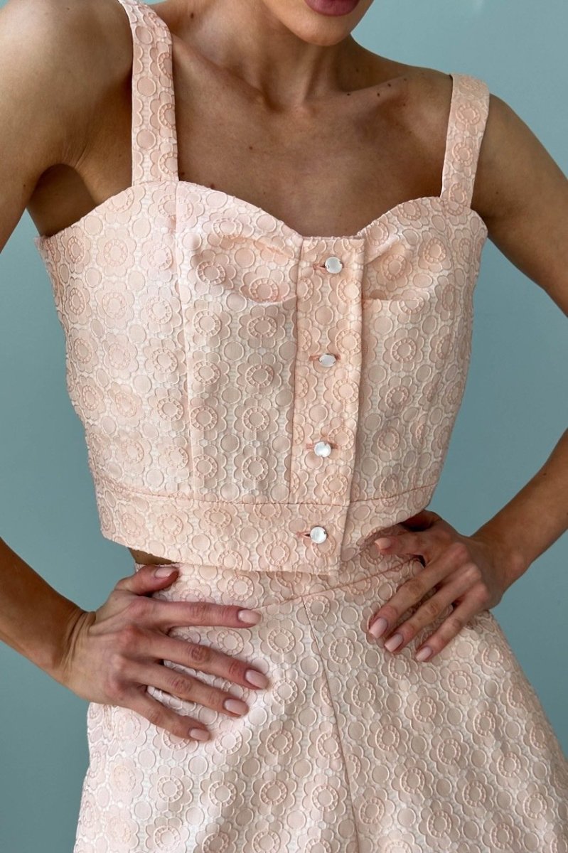 Универсальный летний комплект – топ и шорты из жаккарда. Комплект отлично подойдет для вечерней прогулки или отдыха за городом. Такой костюм можно удачно комбинировать с разными элементами одежды, а значит, всегда оставаться в центре внимания и ловить тысячи комплиментов!