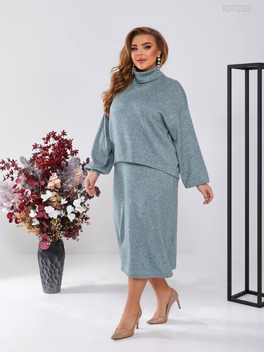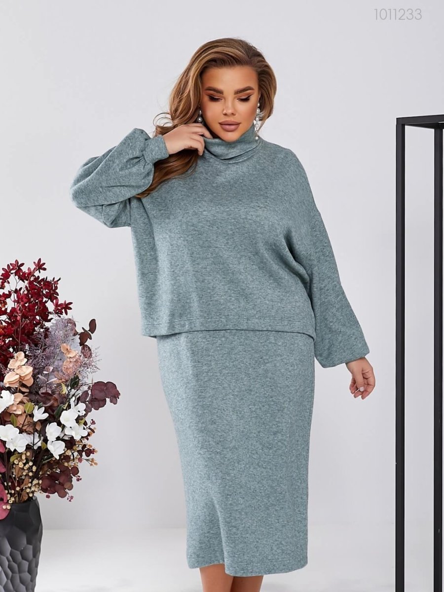 Подробности: платье длиной миди, прямого силуэта. Свитер с высоким горлом и объемным рукавом на манжете.