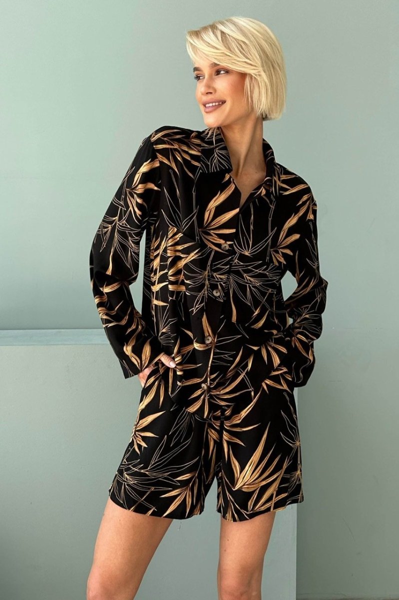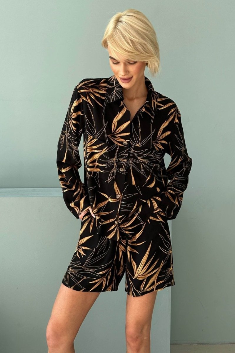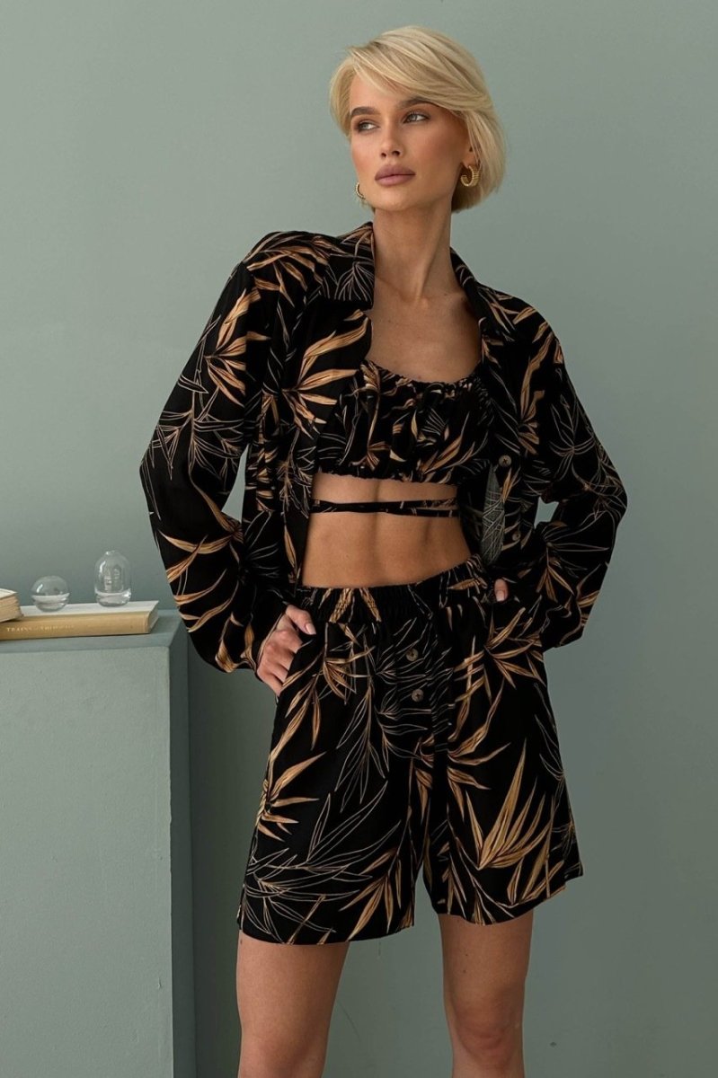 Яркий летний костюм из принтованного льна. Прекрасный выбор на жаркое лето. Комплект с топом, шортами и рубашкой. Рубашка свободного кроя с отложным воротником и застежкой на пуговицы. Короткие шорты с высокой посадкой и боковыми карманами. Эластичная вставка на поясе обеспечивает комфортную посадку.