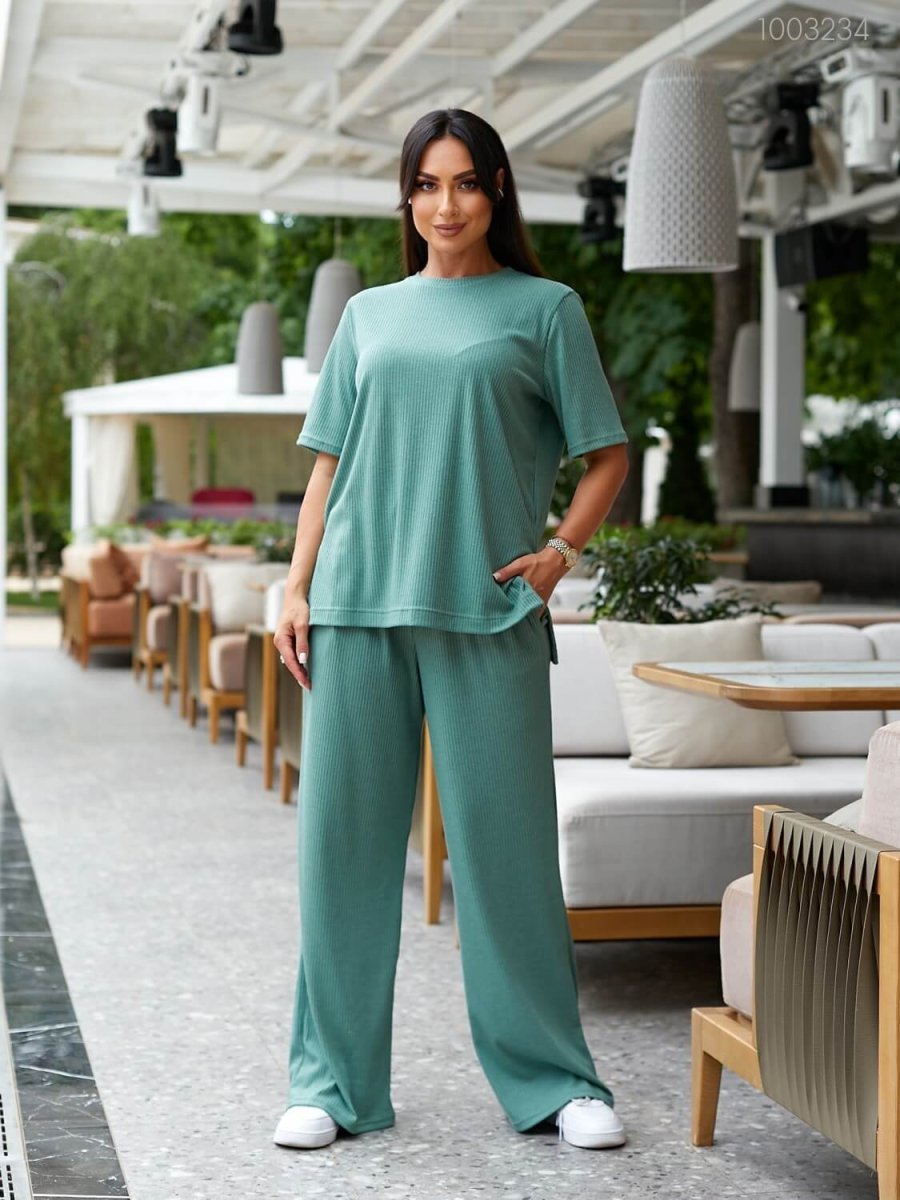 Подробности: длинная футболка свободного кроя с округлой горловиной и рукавом до локтя. Брюки-палаццо на широкой резинке, с глубокими карманами.