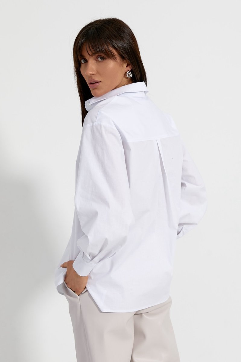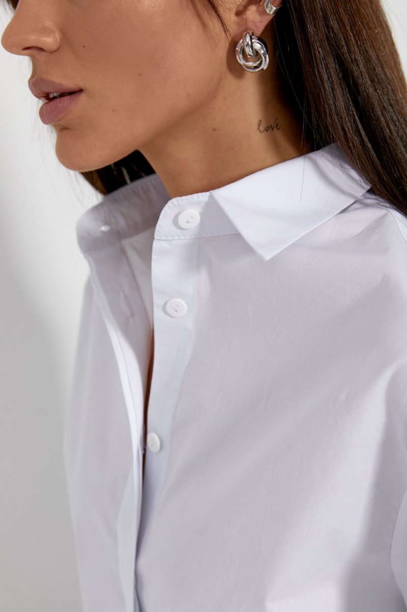 Котоновая рубашка со складками на рукавах и приспущенной линией плеча. Воротник рубашечного типа. Застежка рубашки спереди: скрытая. Спинка с кокеткой и складкой. Рукава вшивные, длинные, по низу манжет, застежка пуговица. В боковых швах: разрез. Отделочная строчка проложена по кокетке спинки, по низу и на манжетах рукава.