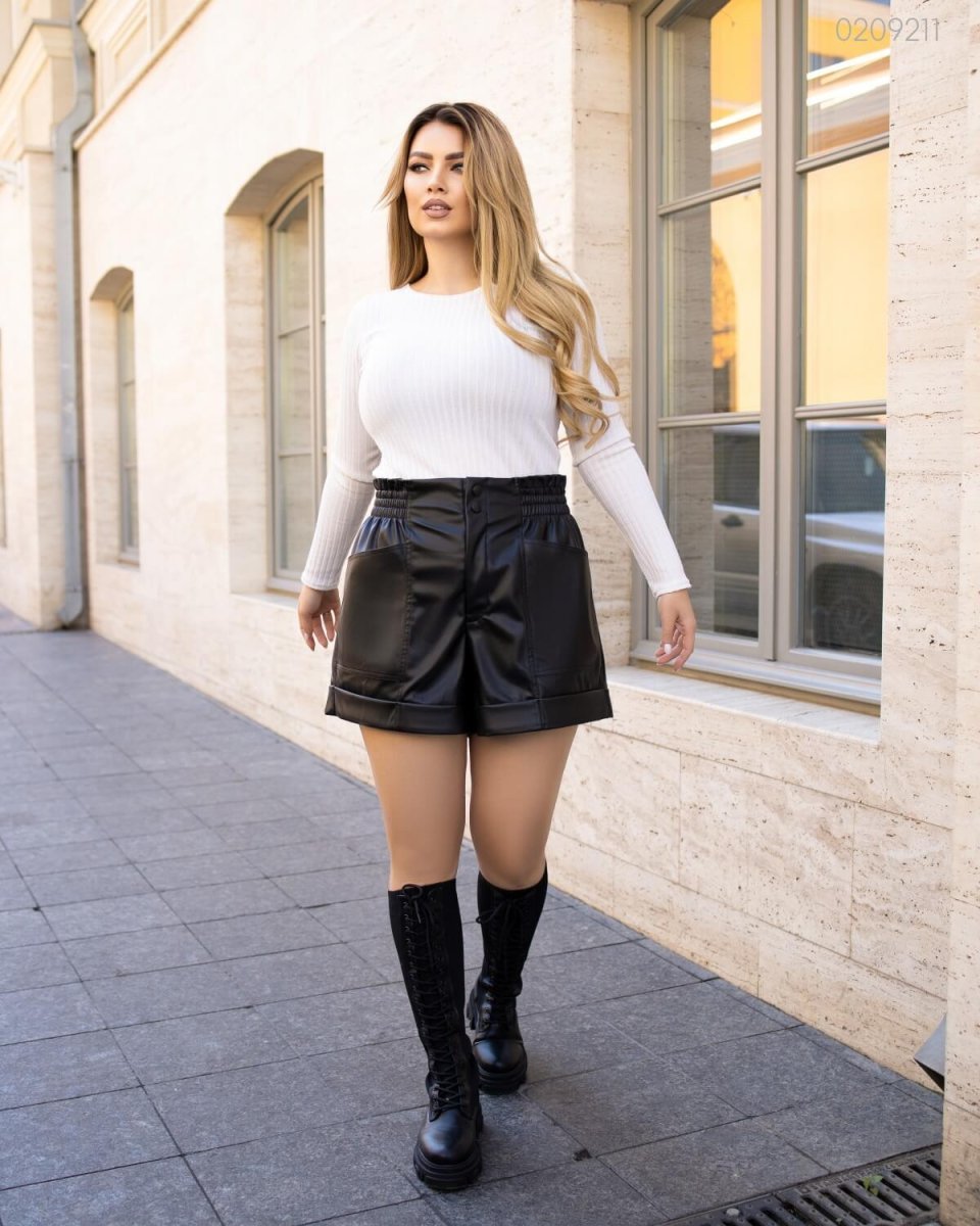 Подробности: высокая посадка, широкий пояс на резинке, глубокие карманы спереди и сзади, застежка – молния и кнопки. Шорты выполнены из эко-кожи на замшевой основе, что делает их невероятно удобными и приятными для тела.