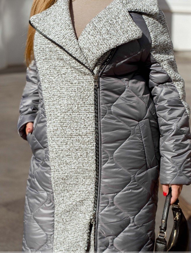 Оригинальная куртка, комбинирующая в себе плащевку и вставки из ткани шерсть- баранчик, на которую вы однозначно обратите внимание. У модели есть отложной воротник, изготовленный из структурной ткани, которая переходит во вставки и комбинируется на рукавах и по основной части изделия. Интересным элементом является молния, которая расположена наискосок. Также мы добавили врезные карманы на основной части изделия.
