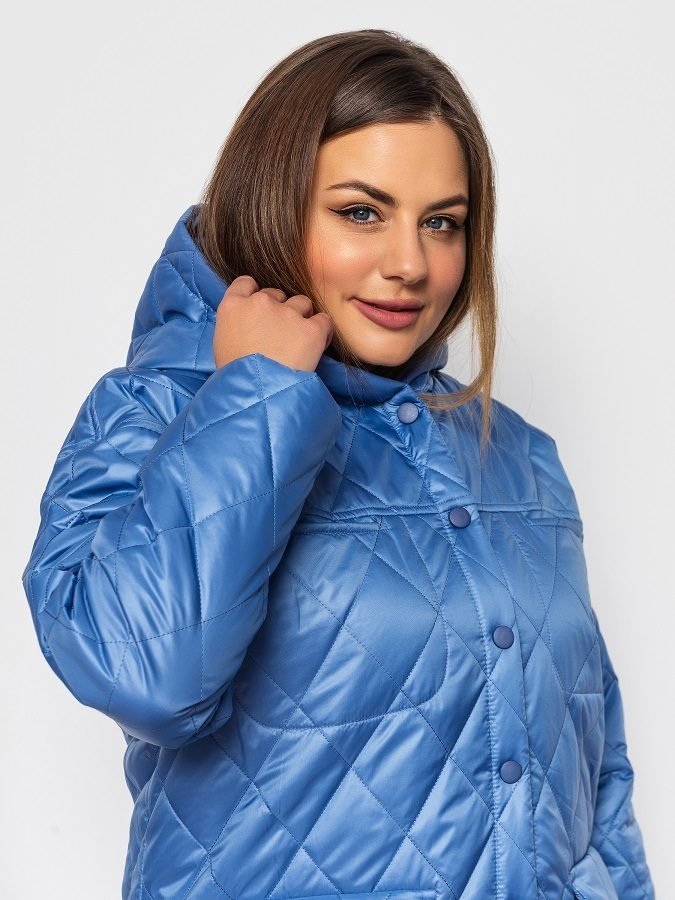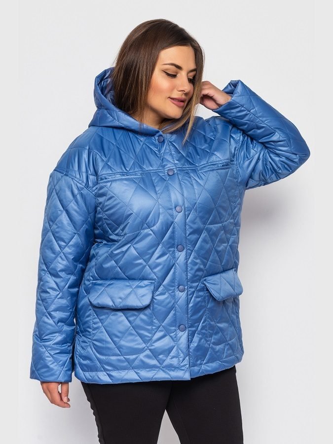Утепленная куртка свободного кроя с капюшоном. Модель застегивается на кнопки, окрашенные в тон основного материала. Вверху прорезные карманы, внизу карманы с клапанами. Спинка слегка удлинена, по боковым швам разрезы.