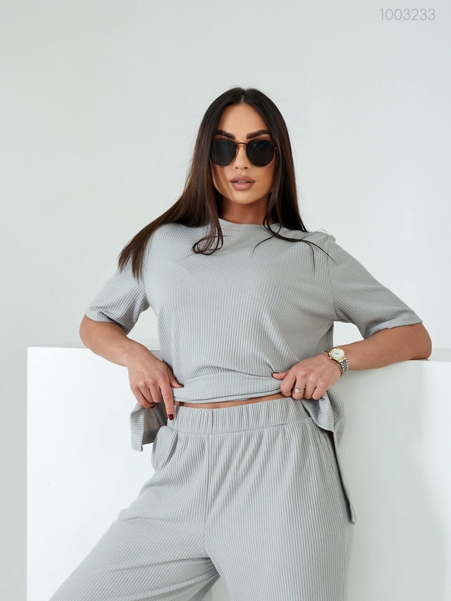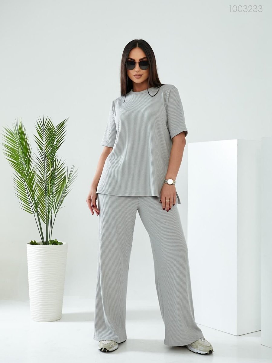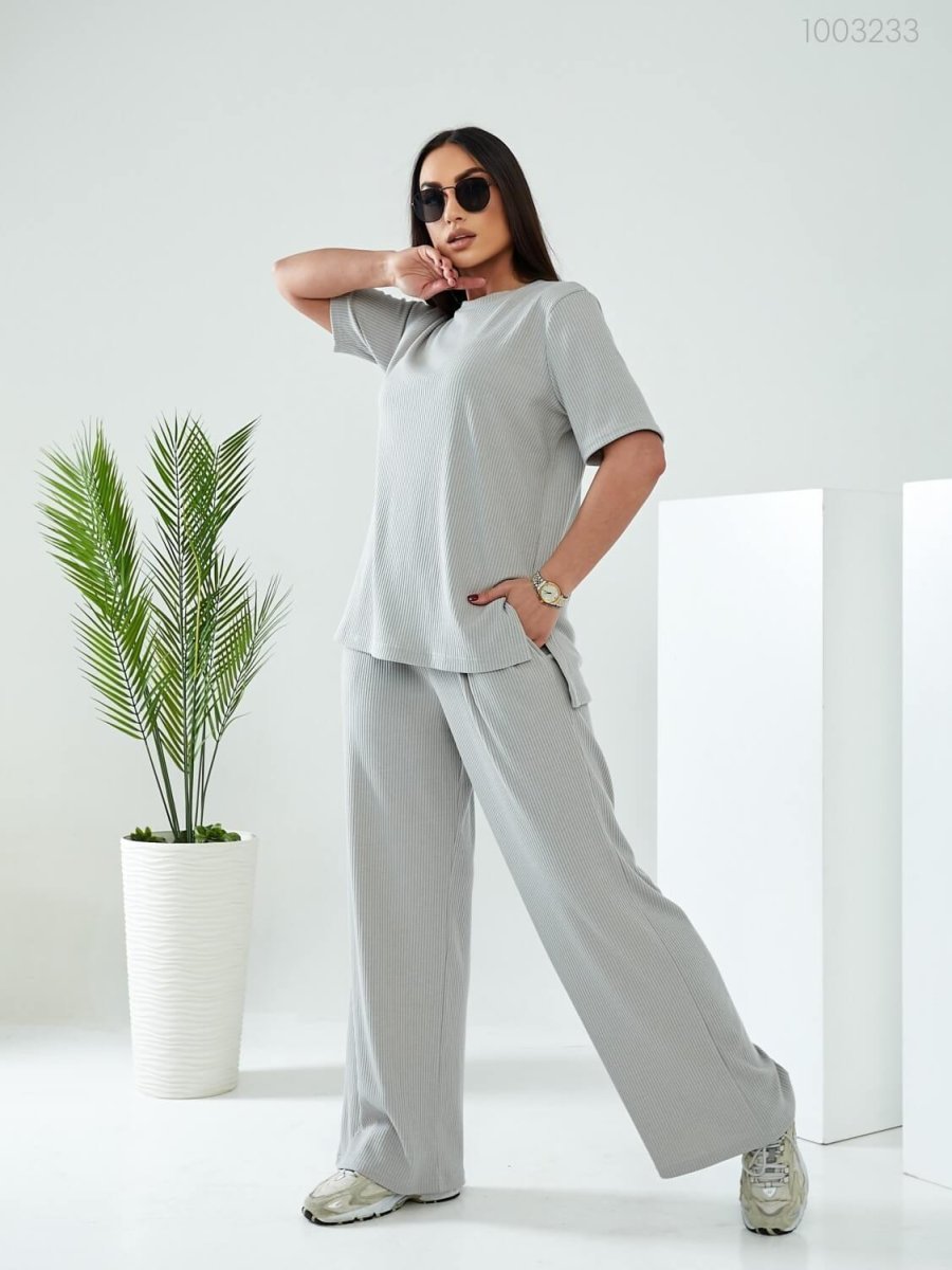 Детали: длинная футболка свободного кроя с округлой горловиной и рукавом до локтя. Брюки-палаццо на широкой резинке, с глубокими карманами.