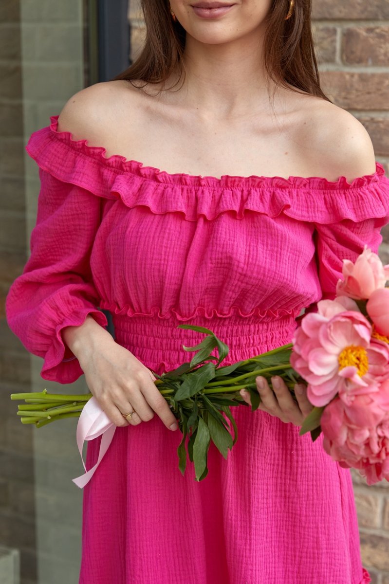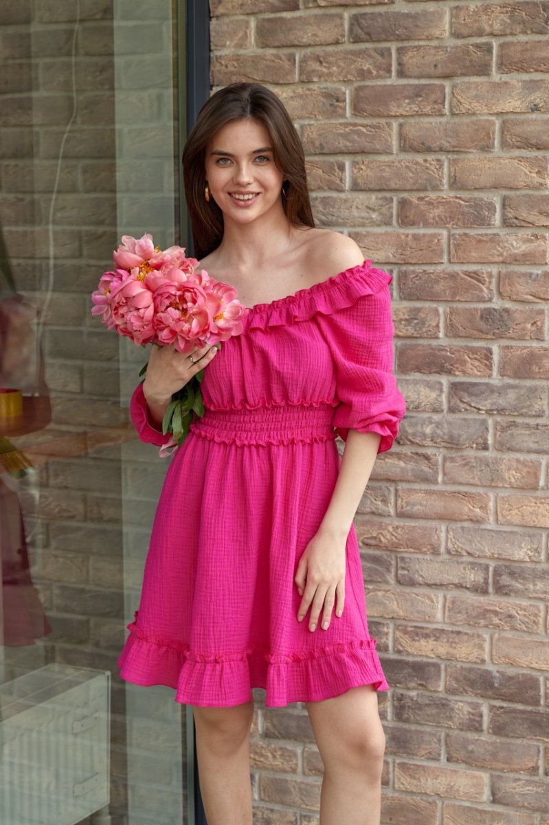 Летнее муслиновое платье мини. Горловина с рюшей. На талии отрезной пояс, собранный резинкой. Лиф и юбка собраны на талии. По низу платья рюша. Рукава длиной 3/4, верхняя часть рукава собрана и служит бретелью, низ рукава собран резиночкой с образованием рюши.