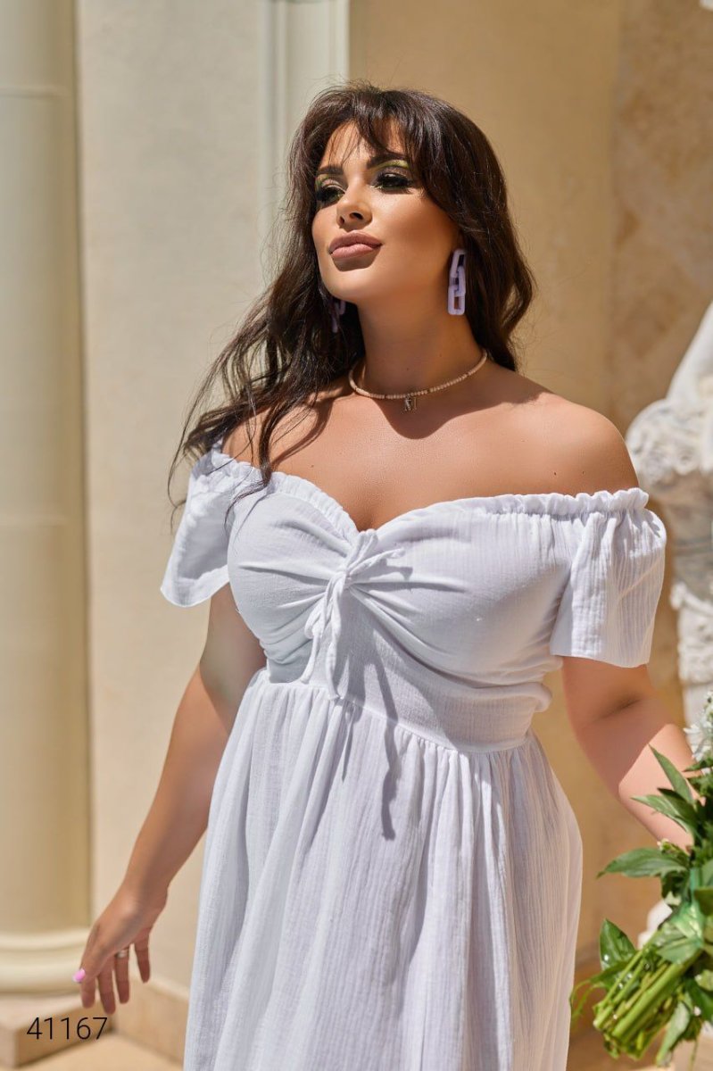 Летнее однотонное платье. Платье можно моделировать: веревочки, расположенные в районе груди, можно завязать бантиком или сделать вырез декольте более глубоким. Сзади шнуровка – регулирует приталенность. Ткань: муслин жатка.