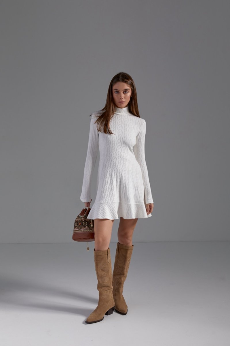 Трикотажное обтягивающее платье длиной до колена, по низу пришивная оборка. Воротник стойка. Рукава вшивные, длинные.