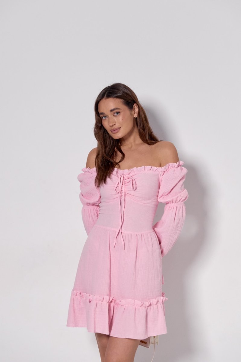 Однотонное муслиновое платье мини. Вырез горловины с рюшей. Спереди со сборкой на груди. Юбка – клеш, собранная на талии, по низу юбки рюша. Рукава длинные. По верху и по низу рукава резинка. Спинка собрана резинкой, гарантирующей прилегание.