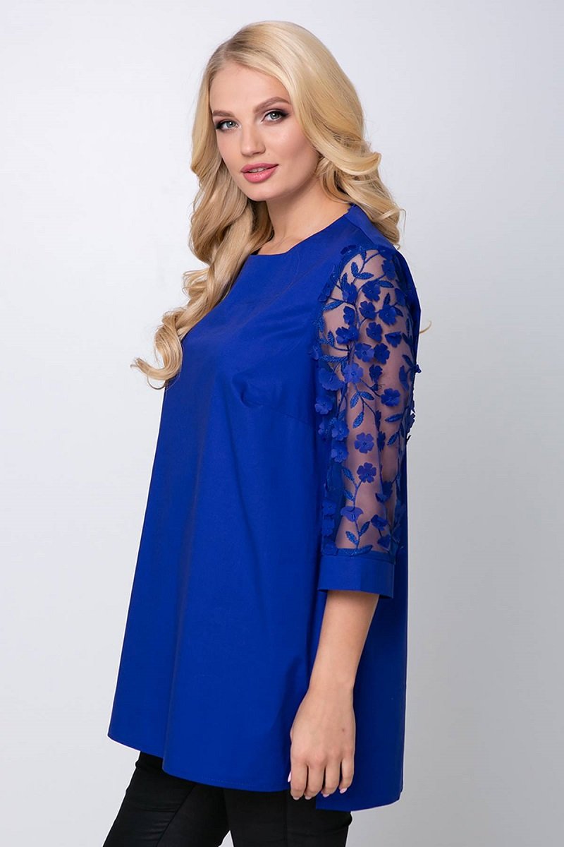 Однотонная прямая туника длиной ниже бедер. Рукава туники из оригинального набивного гипюра с аппликацией.