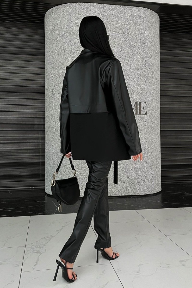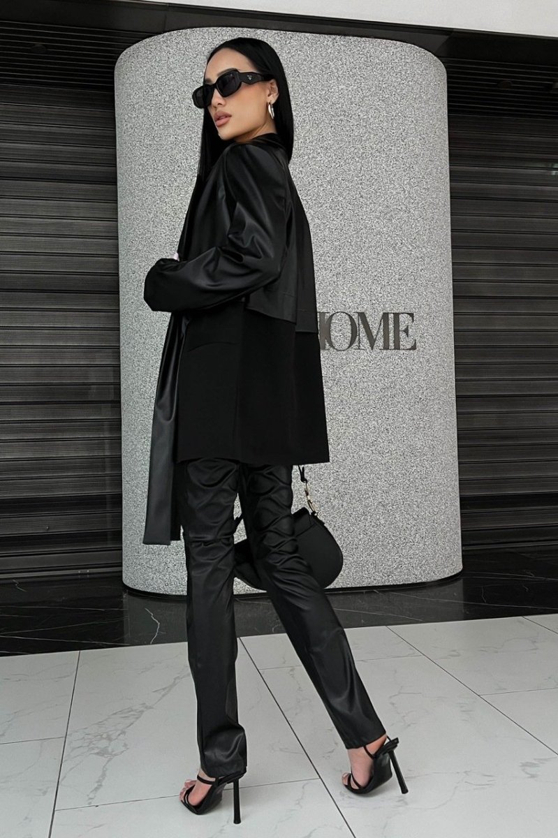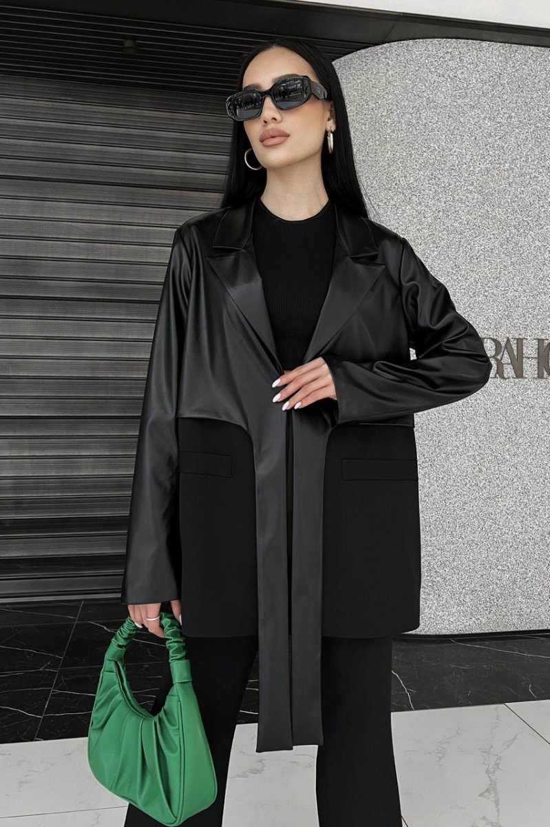 Прямой жакет с выделенной линией плеча и застежкой на один потаенный крючок – стильная модель, которой легко подобрать пару. Ярким акцентом является имитация летних кокеток по переду и спинке. Модель выполнена из эко-кожи и креп-костюмки, модель на подкладке.