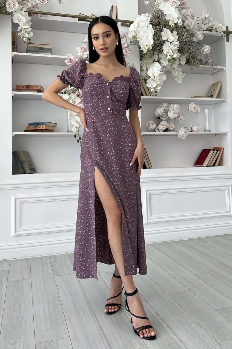 Летнее платье-миди романтического кроя. Выполнена из струящейся принтованной ткани в мелкий цветочный принт. Модель украшает фигурный вырез и оборку по лифу, что подчеркивает зону декольте. Короткий рукав-фонарик с эластичной манжетой. Длинная юбка а-силуэта подчеркивает линию талии. Со стороны предусмотрен небольшой разрез.
