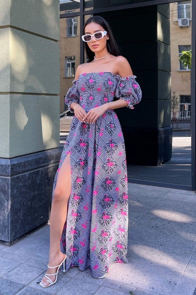 Нежность ассоциируется исключительно с легкими тканями и воздушным кроем – чрезвычайно эффектное и сексуальное летнее платье в пол из принтованного штапеля – то, что нужно на жаркое лето. Длинная юбка в пол визуально вытянет силуэт, придаст Вам шарм и привлекательность. Интересно оформленный лиф на резинках платья будут притягивать взгляды противоположного пола. А разрез по юбке привлекут внимание к Вашим ножкам! Безусловно, в этом платье Вы будете королевой вечера.