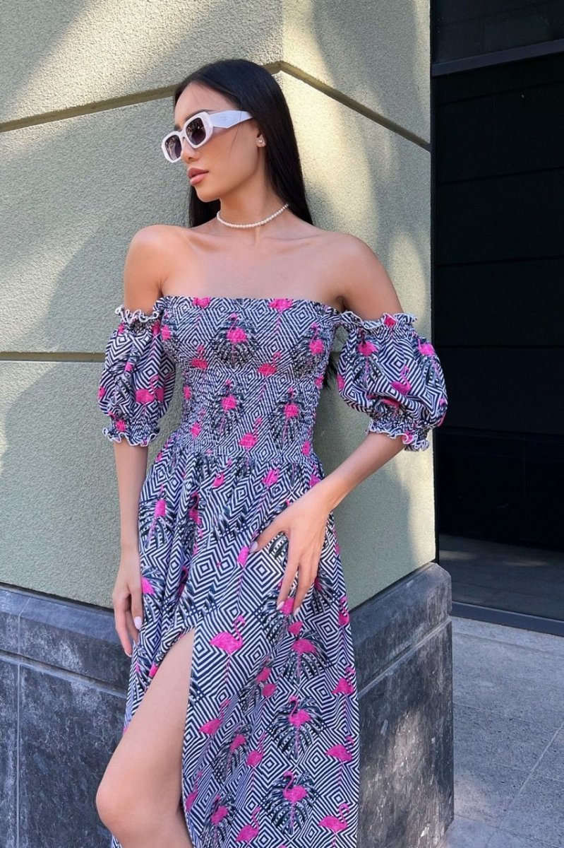 ● Декоративные элементы: резинка по лифу, высокий разрез по переду.