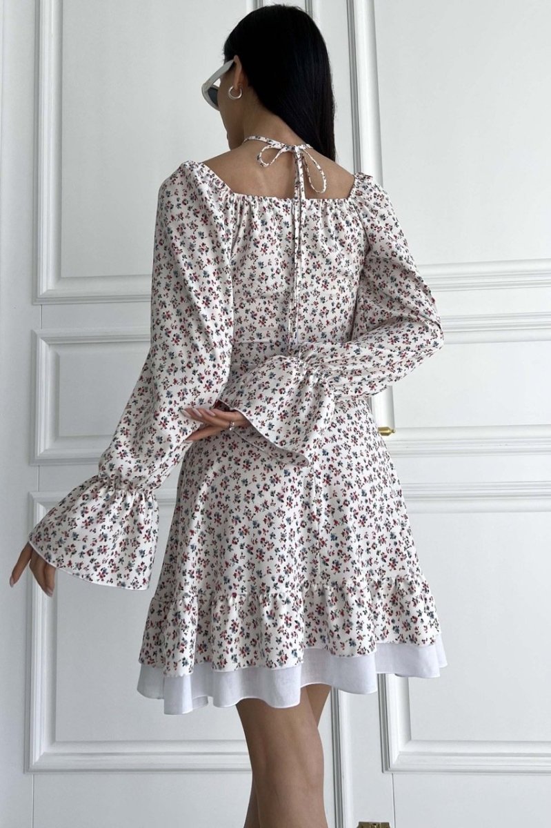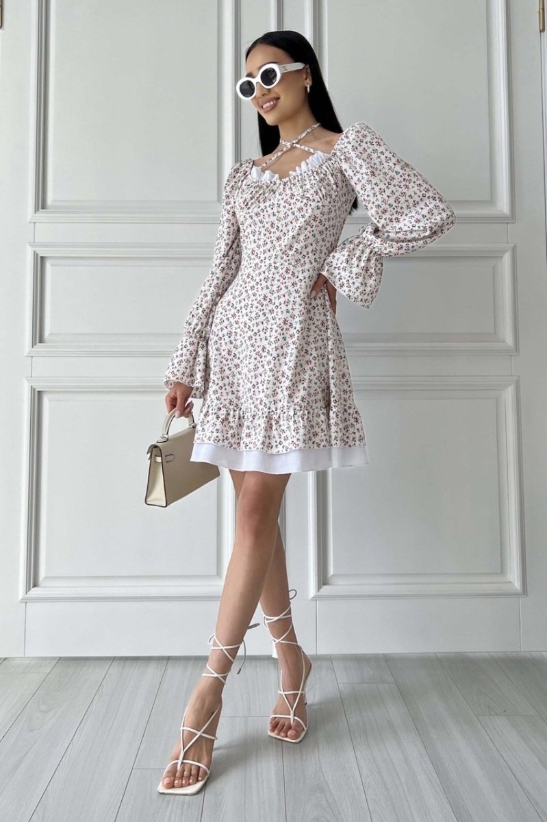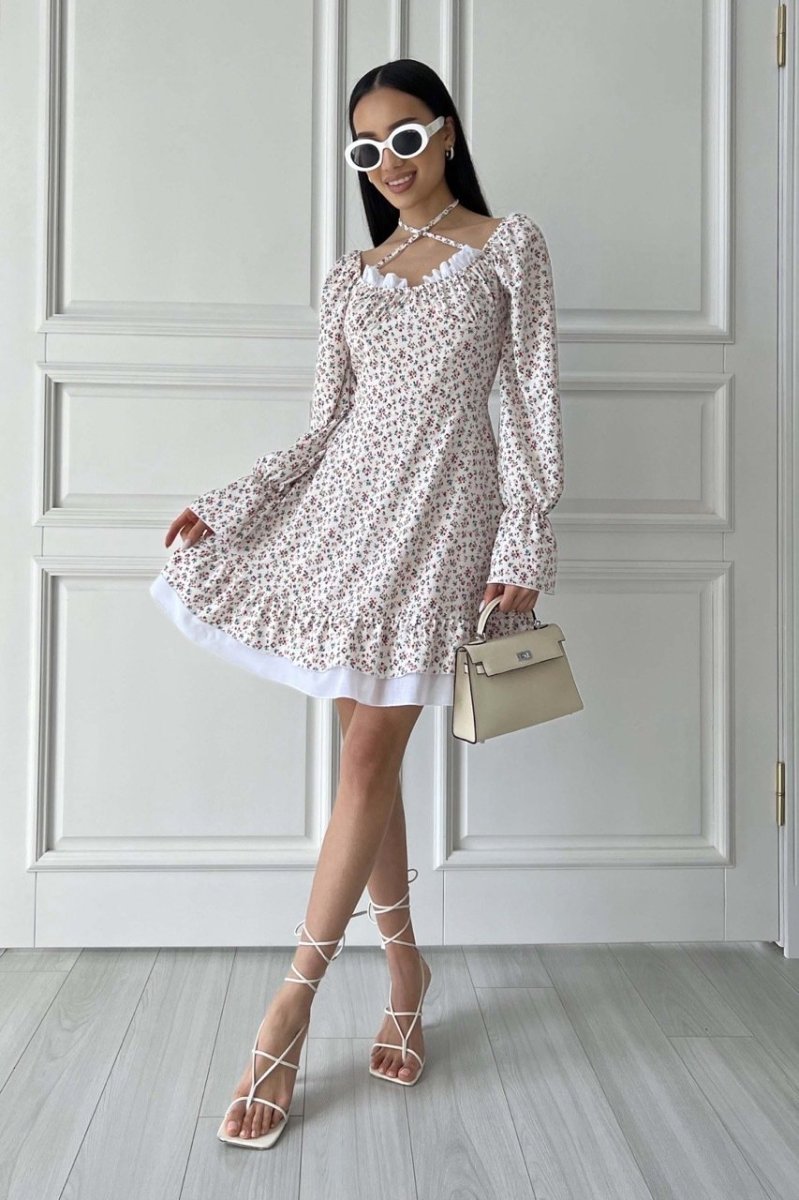 Нежное платье из легкой ткани в весенне-летний принт, украшенное игривыми воланами по юбке и лифу. Модель представлена в широкой цветовой гамме, длина мини. Платье приталенного кроя с длинными рукавами с эластичными вставками. Легкий софт придает образу игривость и романтичность. Цветочный принт остается актуальным вне сезона. Застёгивается на молнию по спинке.
