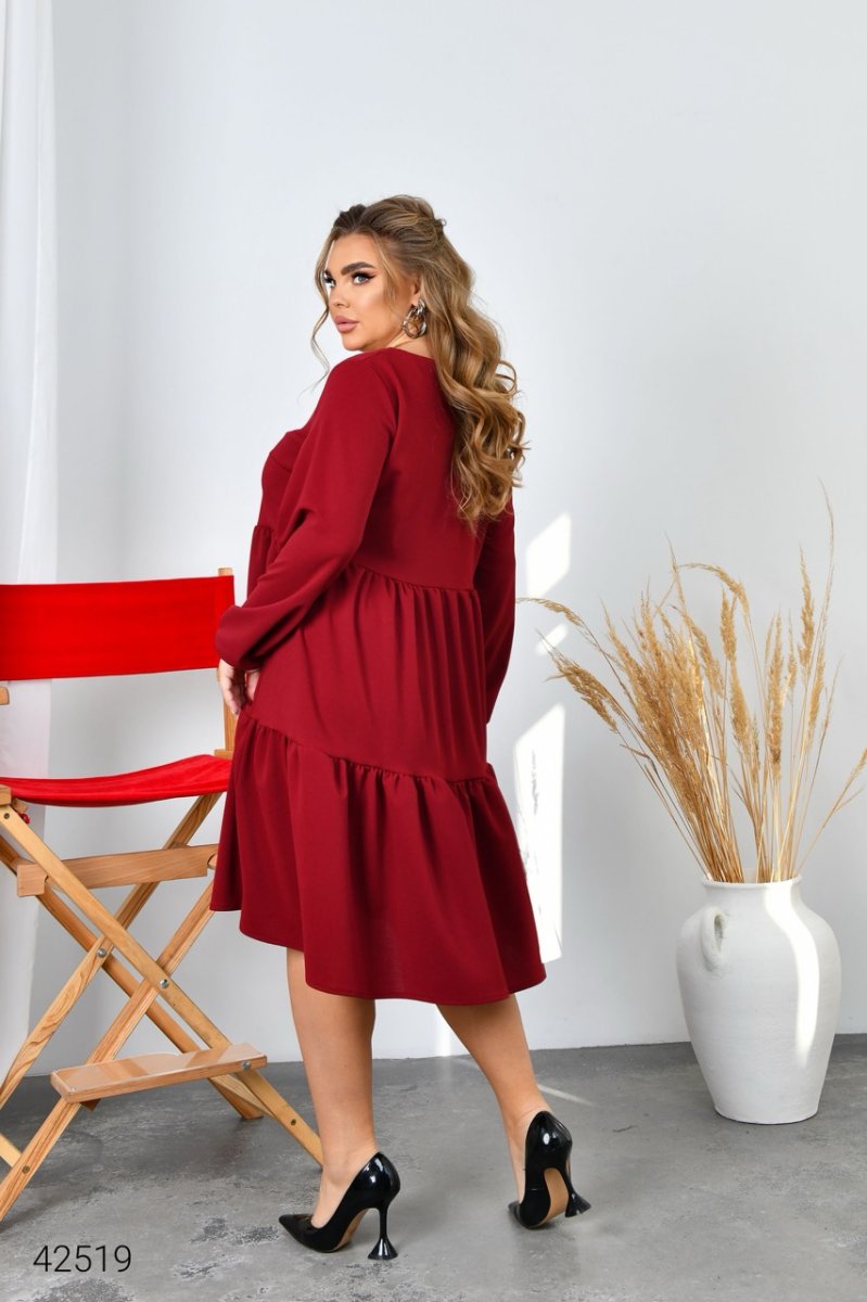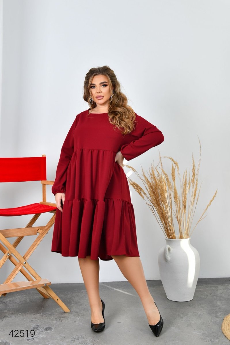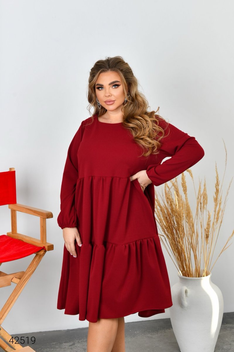 Платье свободного кроя. Юбка выполнена из двух ярусов.Вырез горловины круглый, рукав длинный, на резинке.
