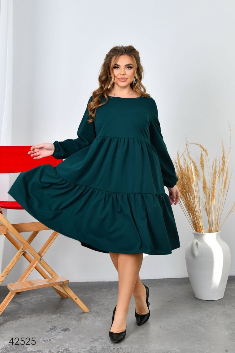 Платье свободного кроя. Юбка выполнена из двух ярусов.Вырез горловины круглый, рукав длинный, на резинке.